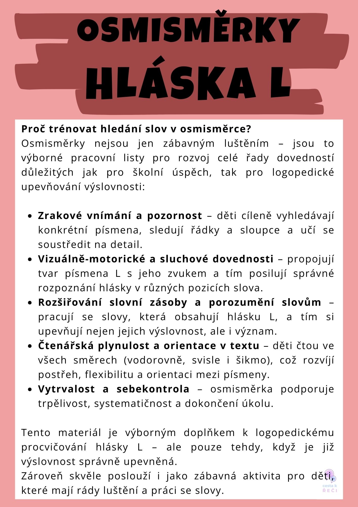 Osmisměrky pomáhají rozvíjet zrakové vnímání, orientaci v textu, pozornost a slovní zásobu, a zároveň přirozeně podporují automatizaci hlásky L v řeči.