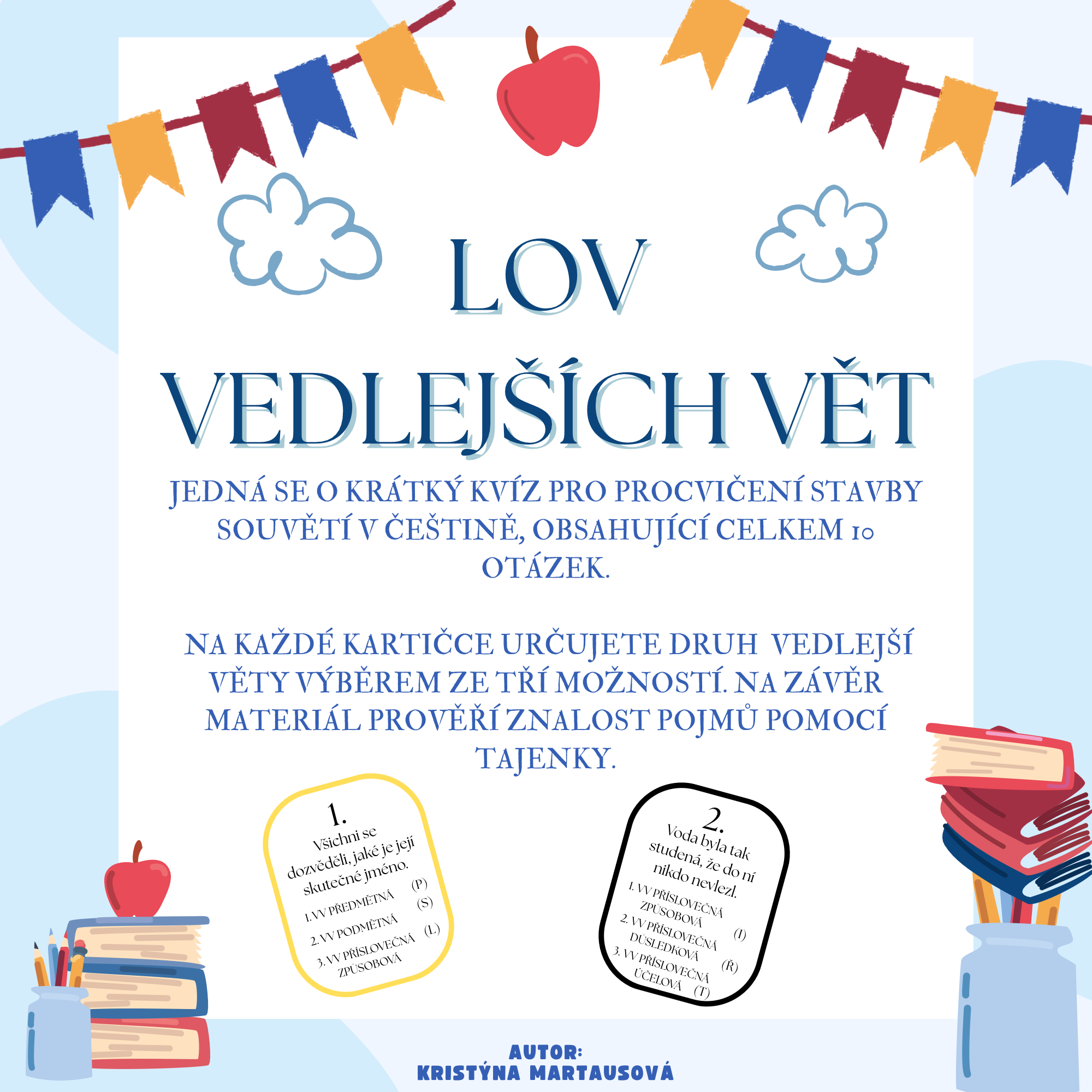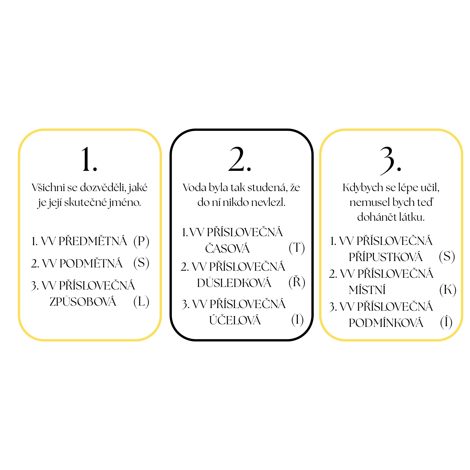 - 10 kvízových kartiček: Zde určíte druh vedlejší věty (např. předmětná, přívlastková, časová) výběrem ze tří možností.