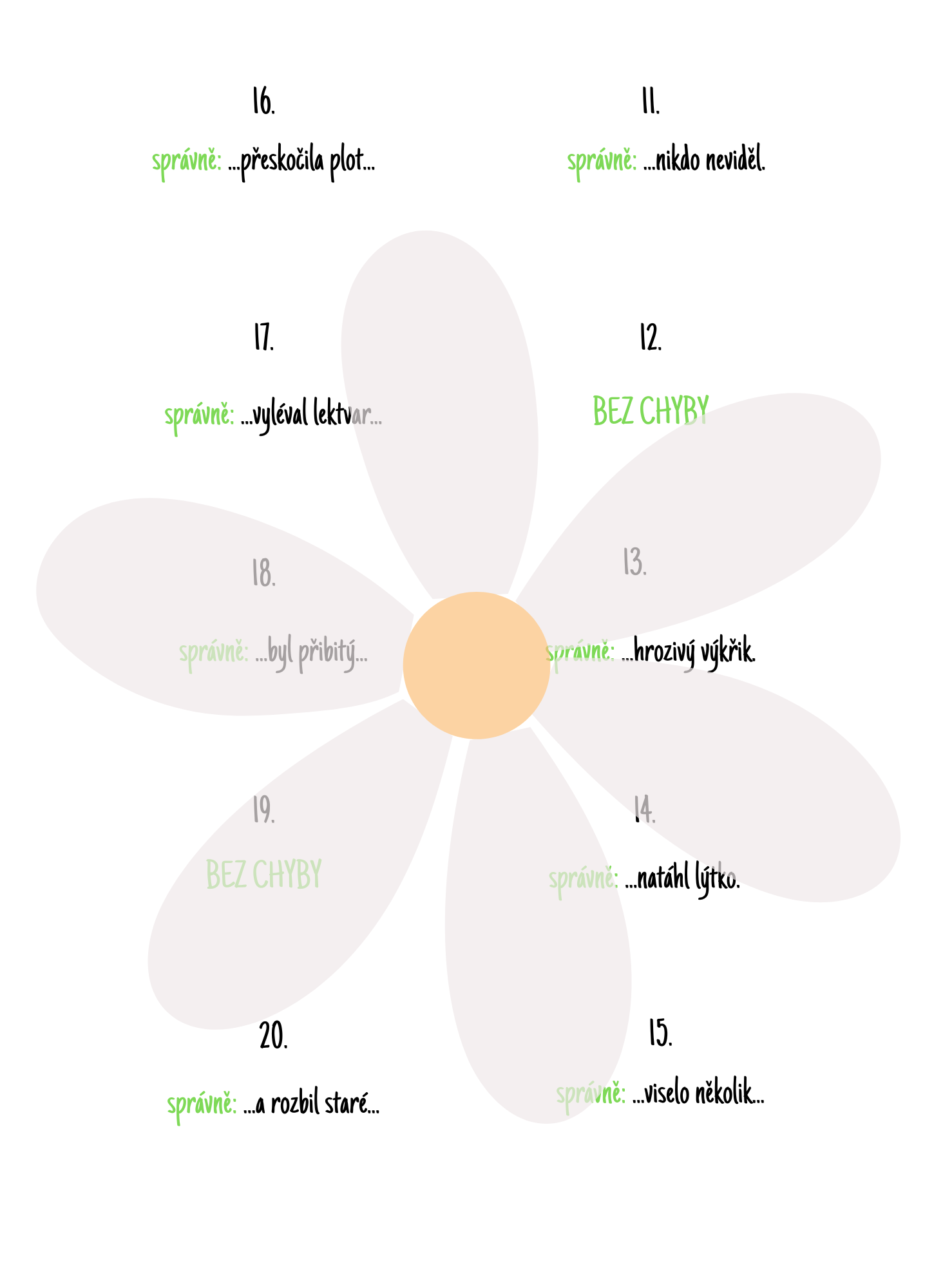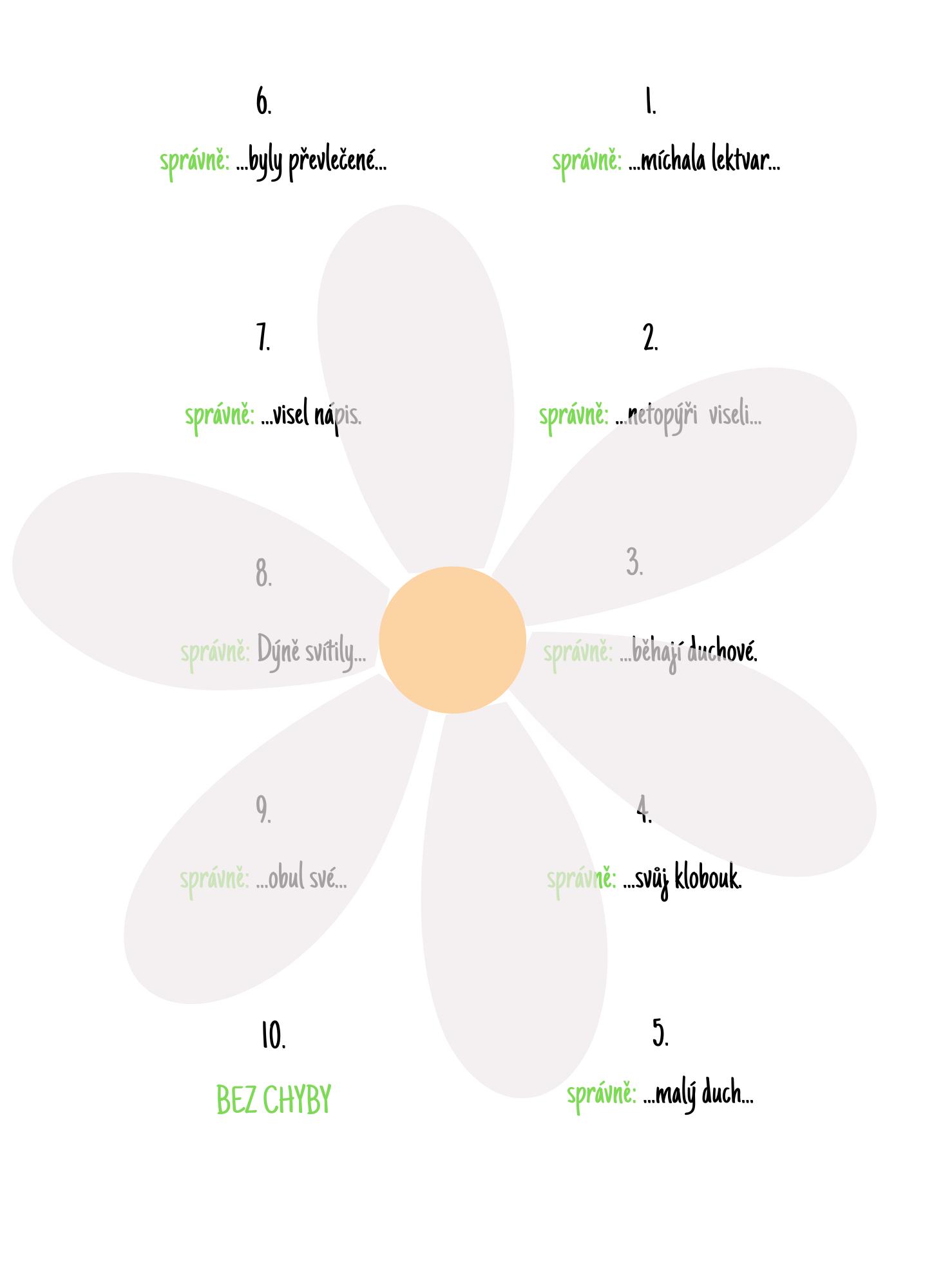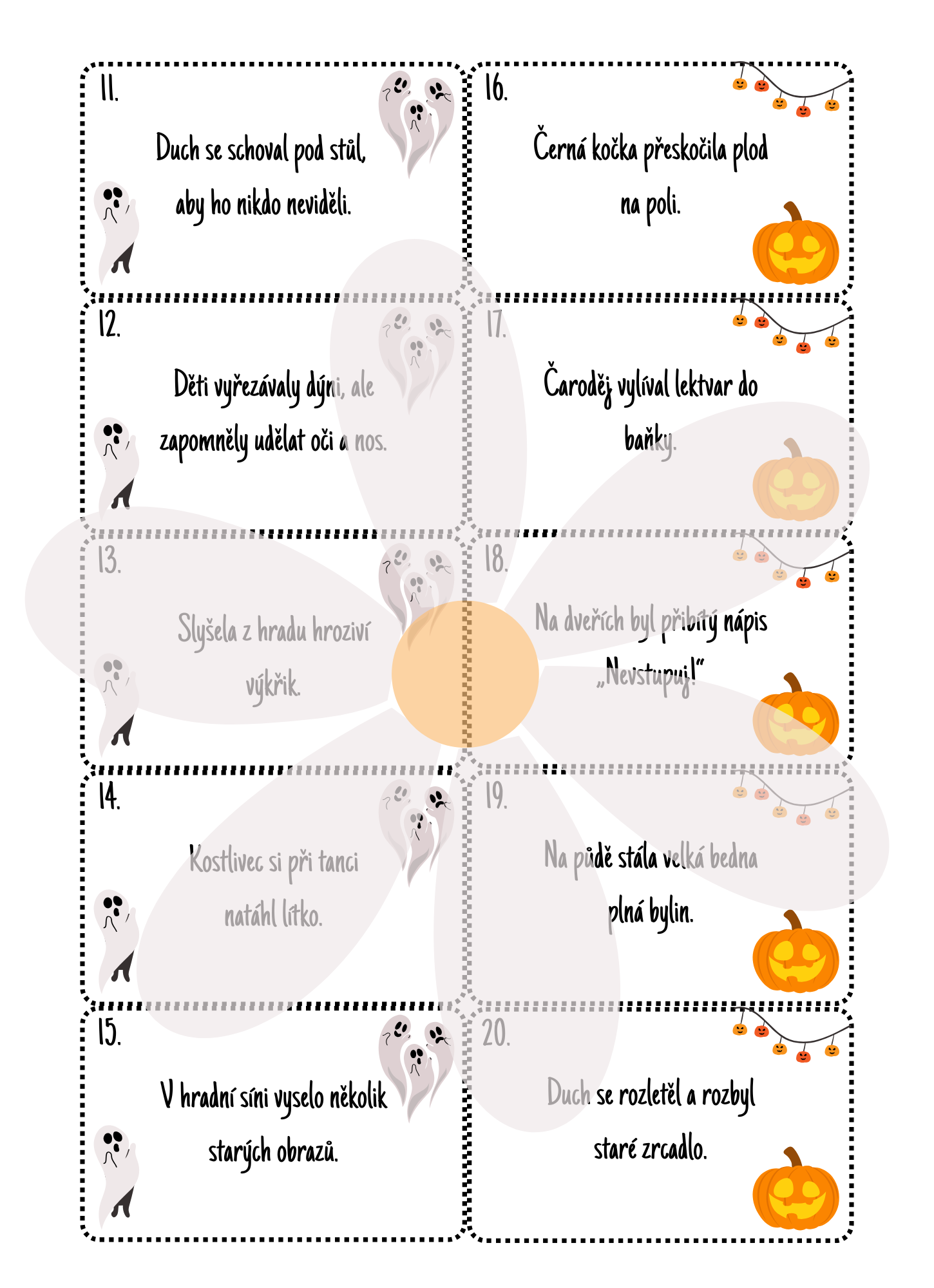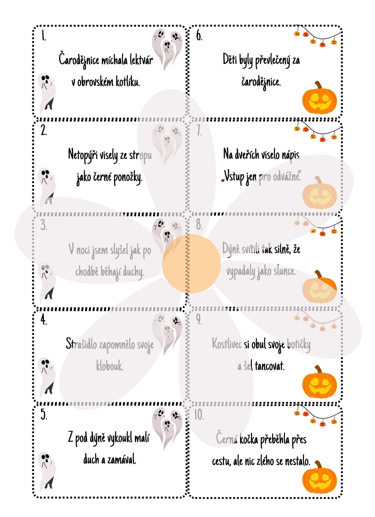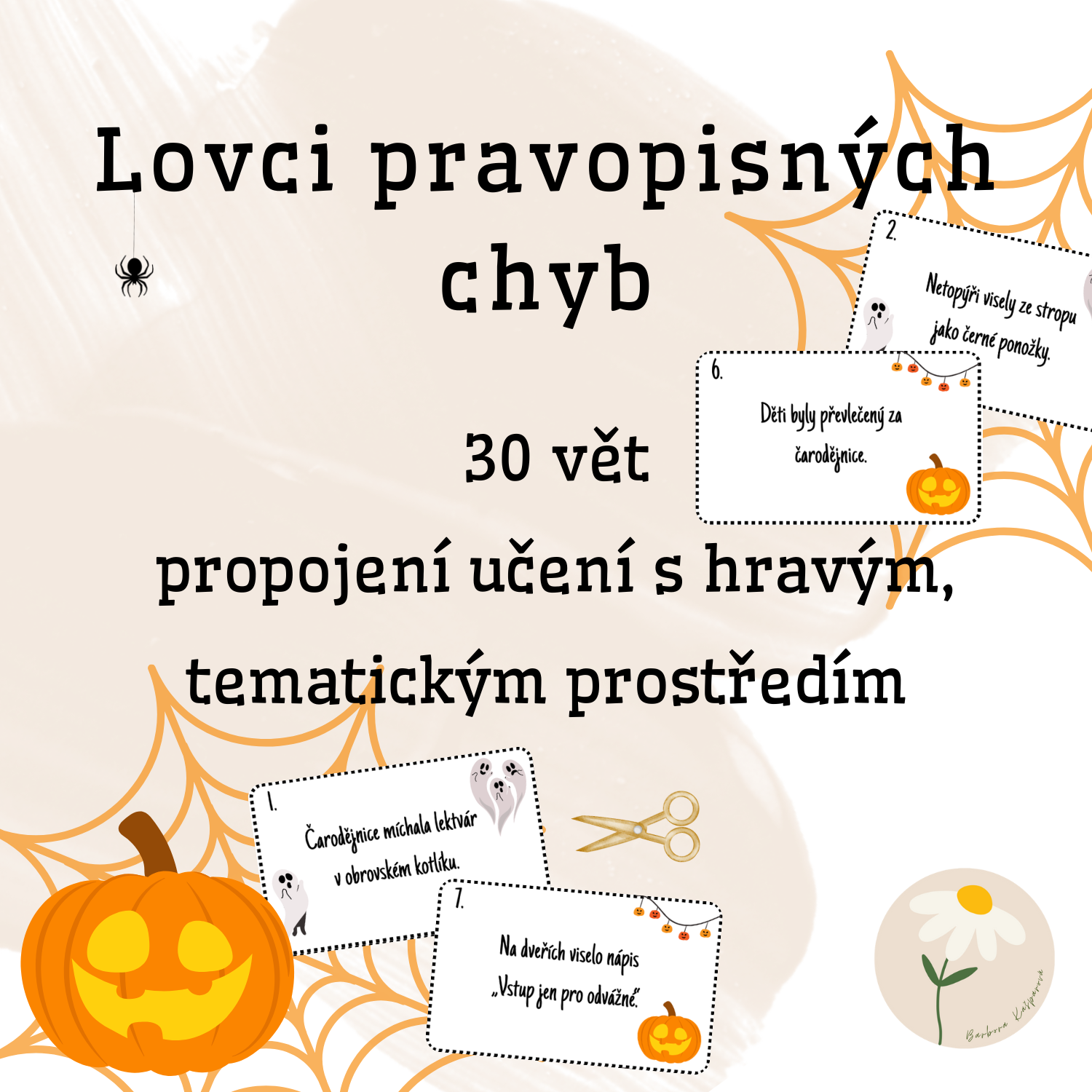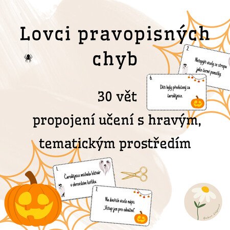 30 vět s halloweenskou a podzimní tematikou, v každé větě se skrývá pravopisná chyba, součástí jsou i správné tvary vět – vhodné pro kontrolu nebo práci s druhou stranou kartiček, možnost využití ve formě kartiček, pracovního listu nebo skupinové hry.