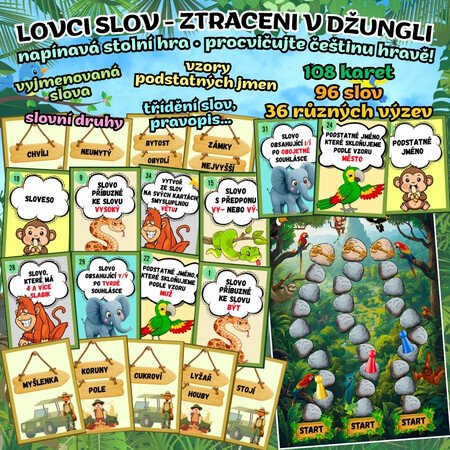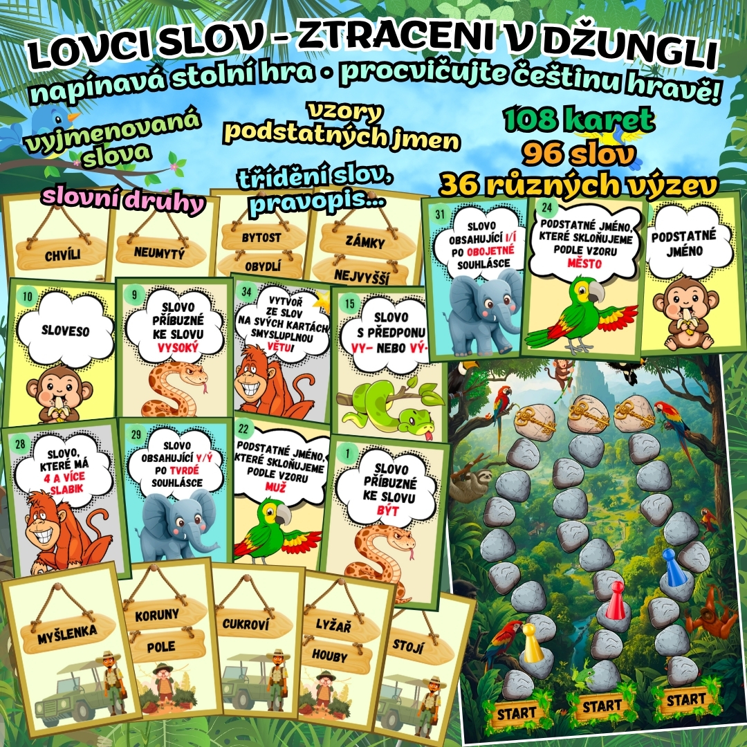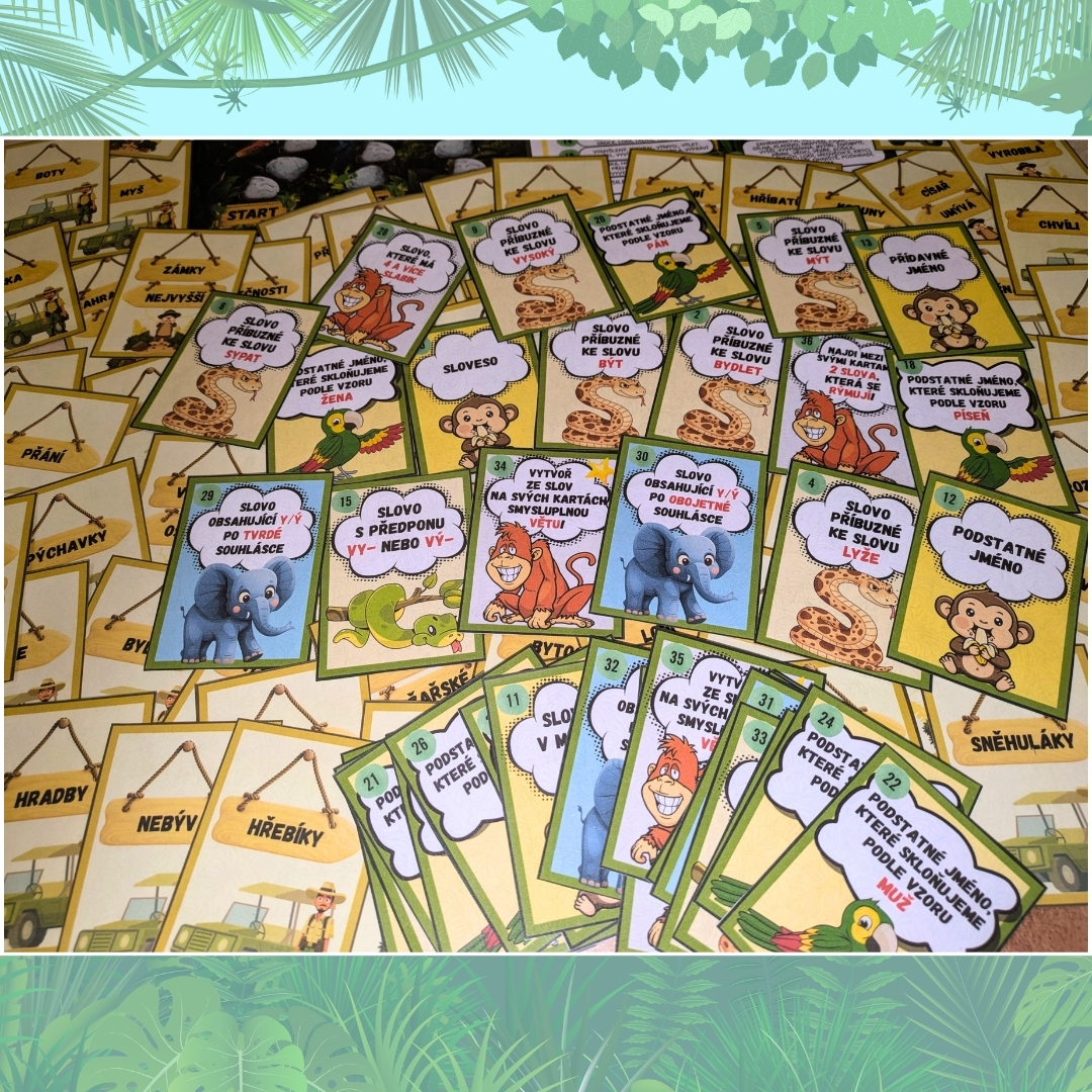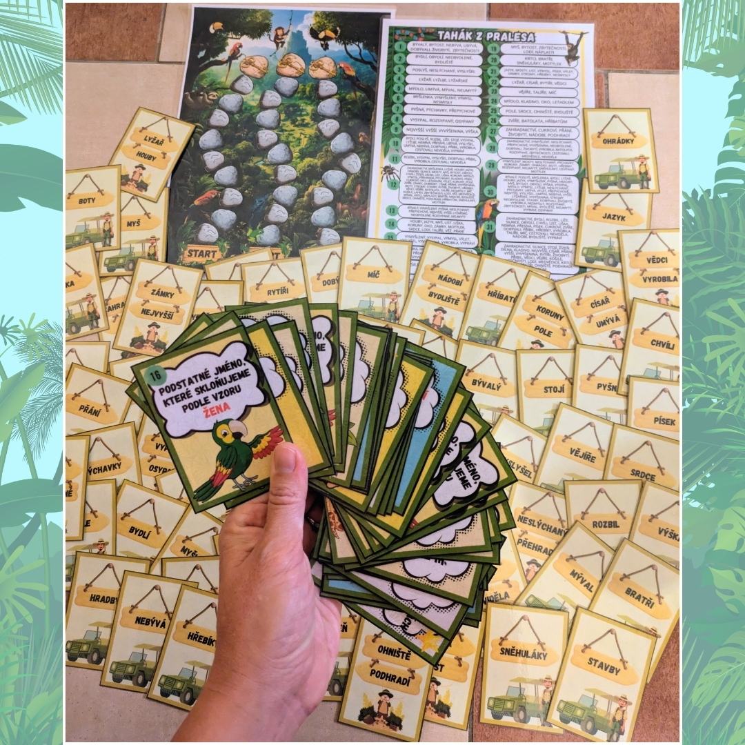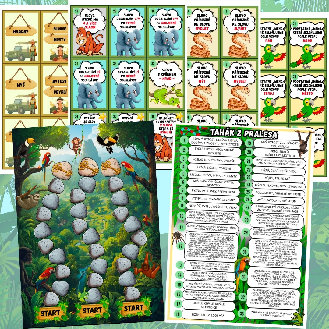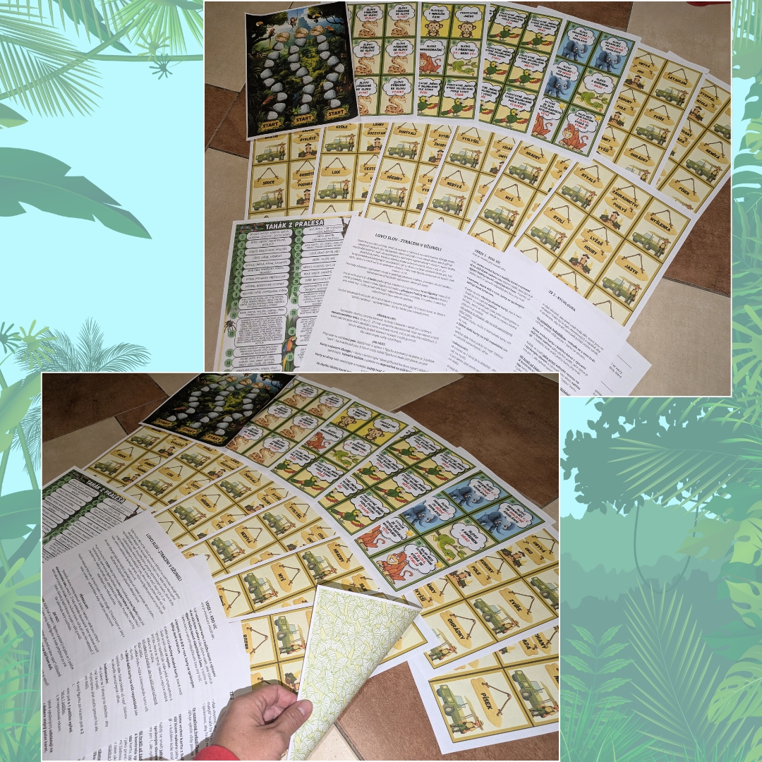 Soubor obsahuje hrací pole, 36 hracích karet s výzvami džungle, 72 hracích karet se slovy a "tahák z pralesa" - správné řešení.