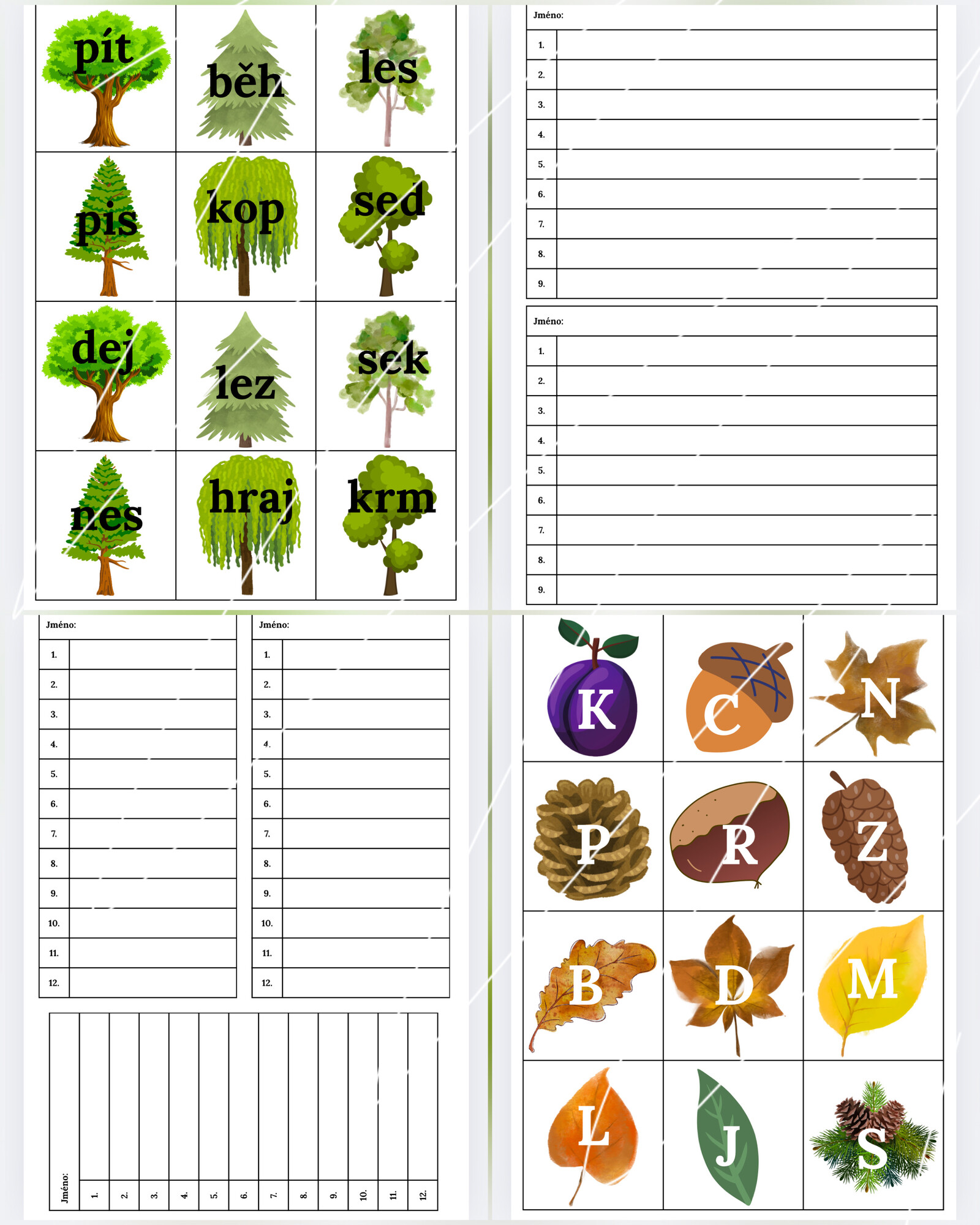 12 obrázků stromů, na každém jedno písmenko (např. B - buk, O - Olše...)