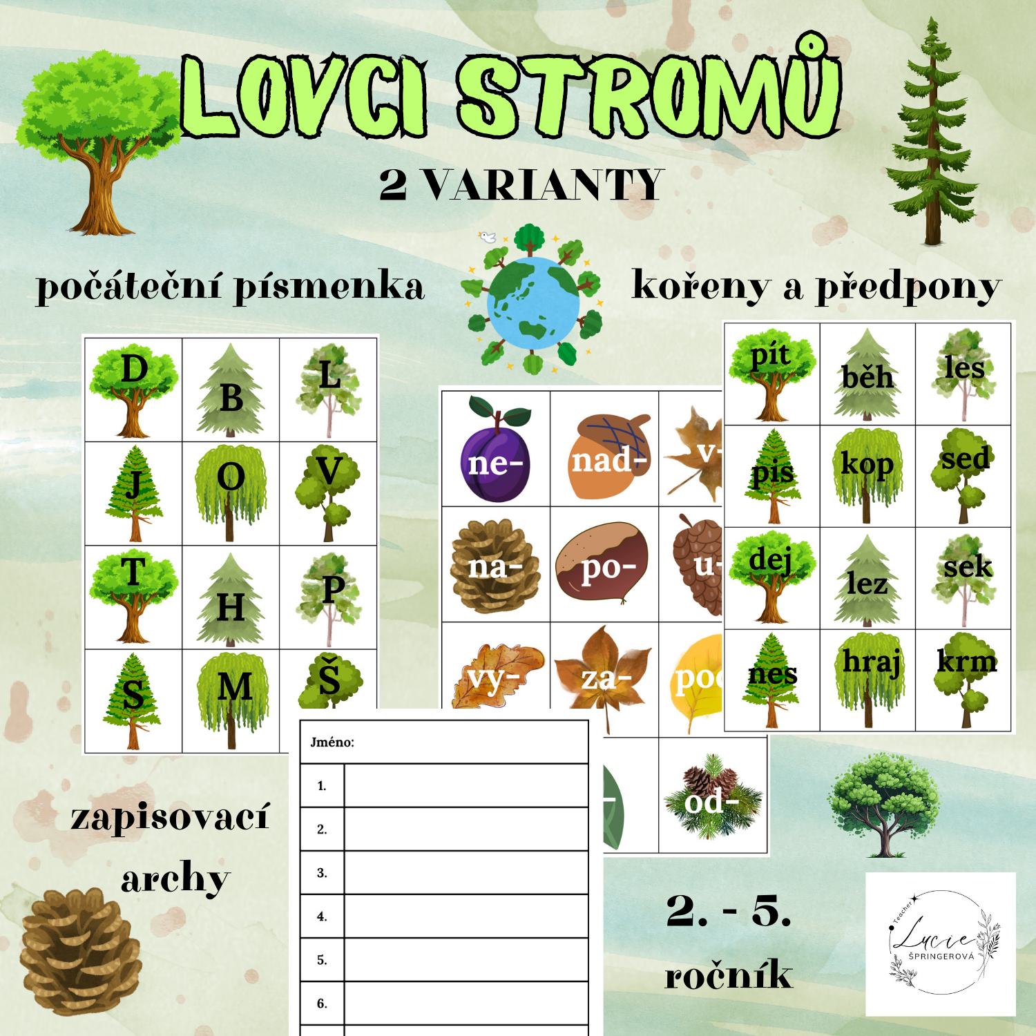 Žáci hledají po třídě stromy, kde jsou písmenka nebo kořeny a předpony. Součástí je i arch na zapisování.