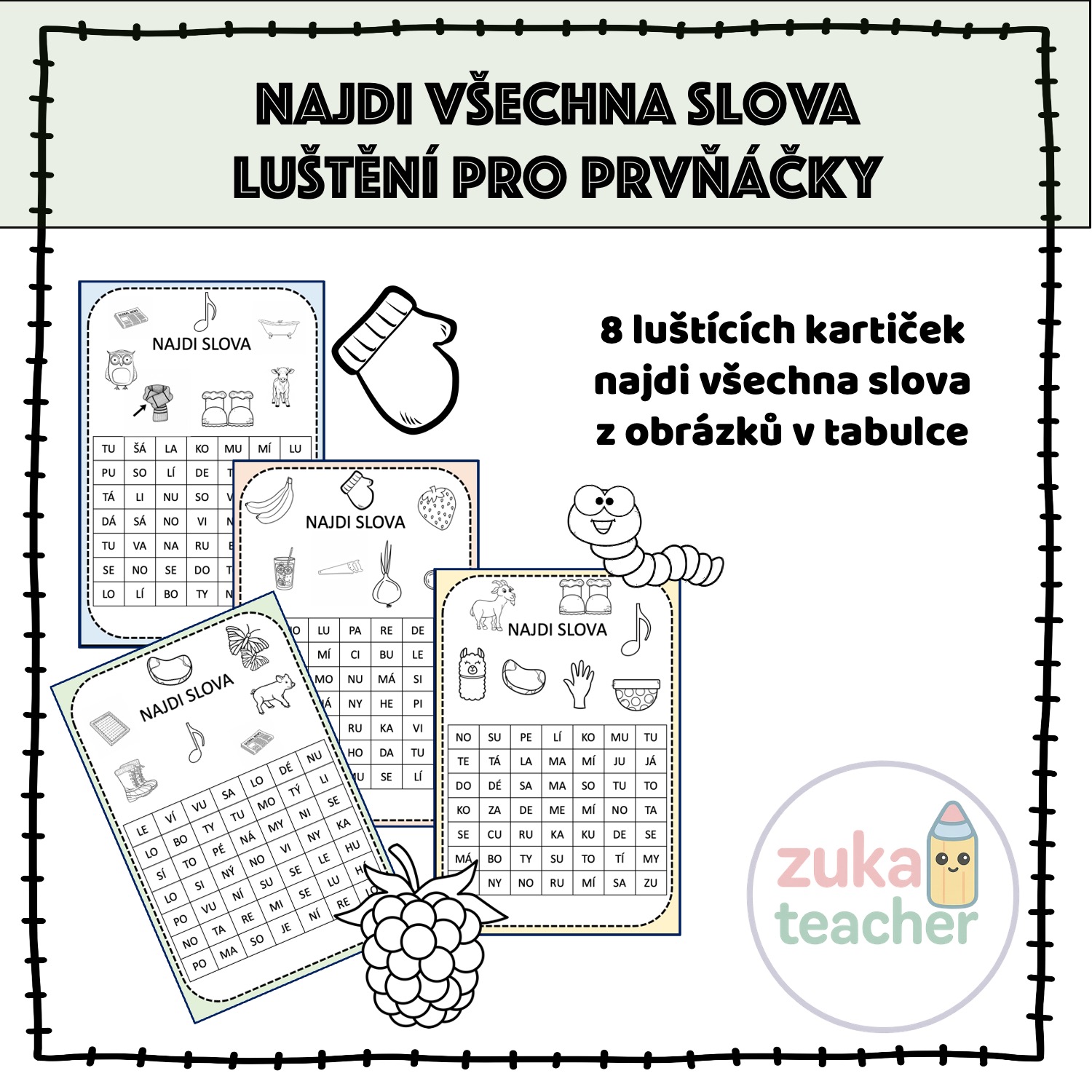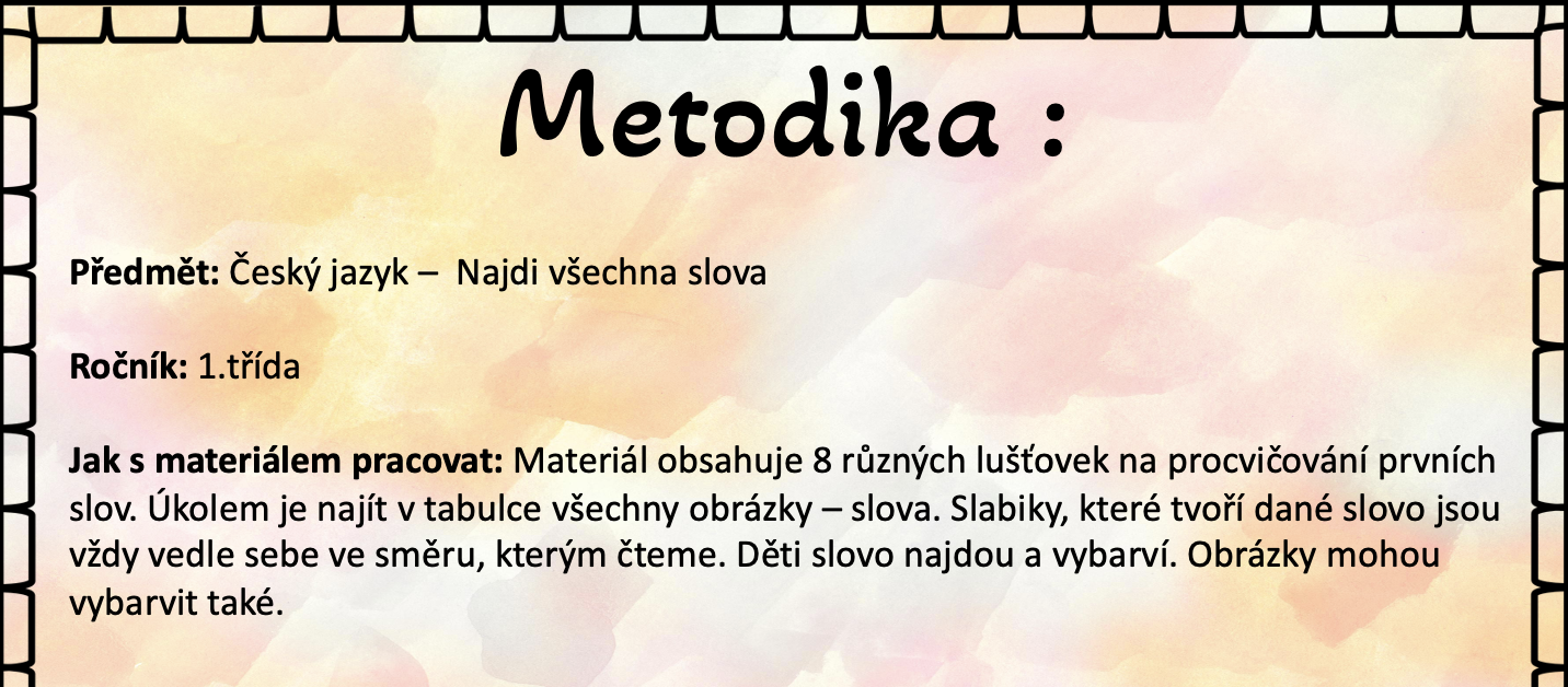Materiál obsahuje 8 různých lušťovek na procvičování prvních slov. Úkolem je najít v tabulce všechny obrázky – slova. Slabiky, které tvoří dané slovo jsou vždy vedle sebe ve směru, kterým čteme. Děti slovo najdou a vybarví. Obrázky mohou vybarvit také.