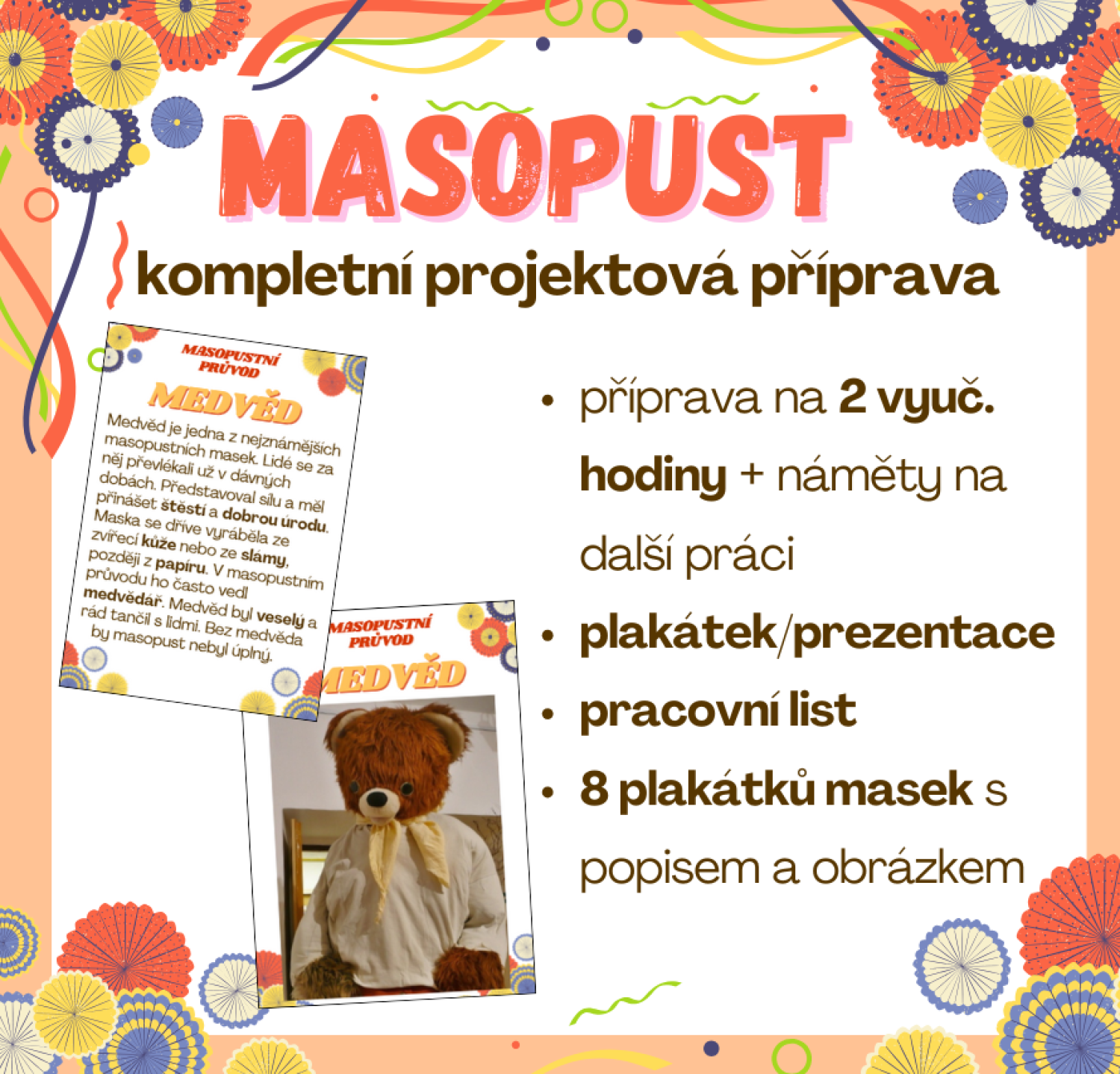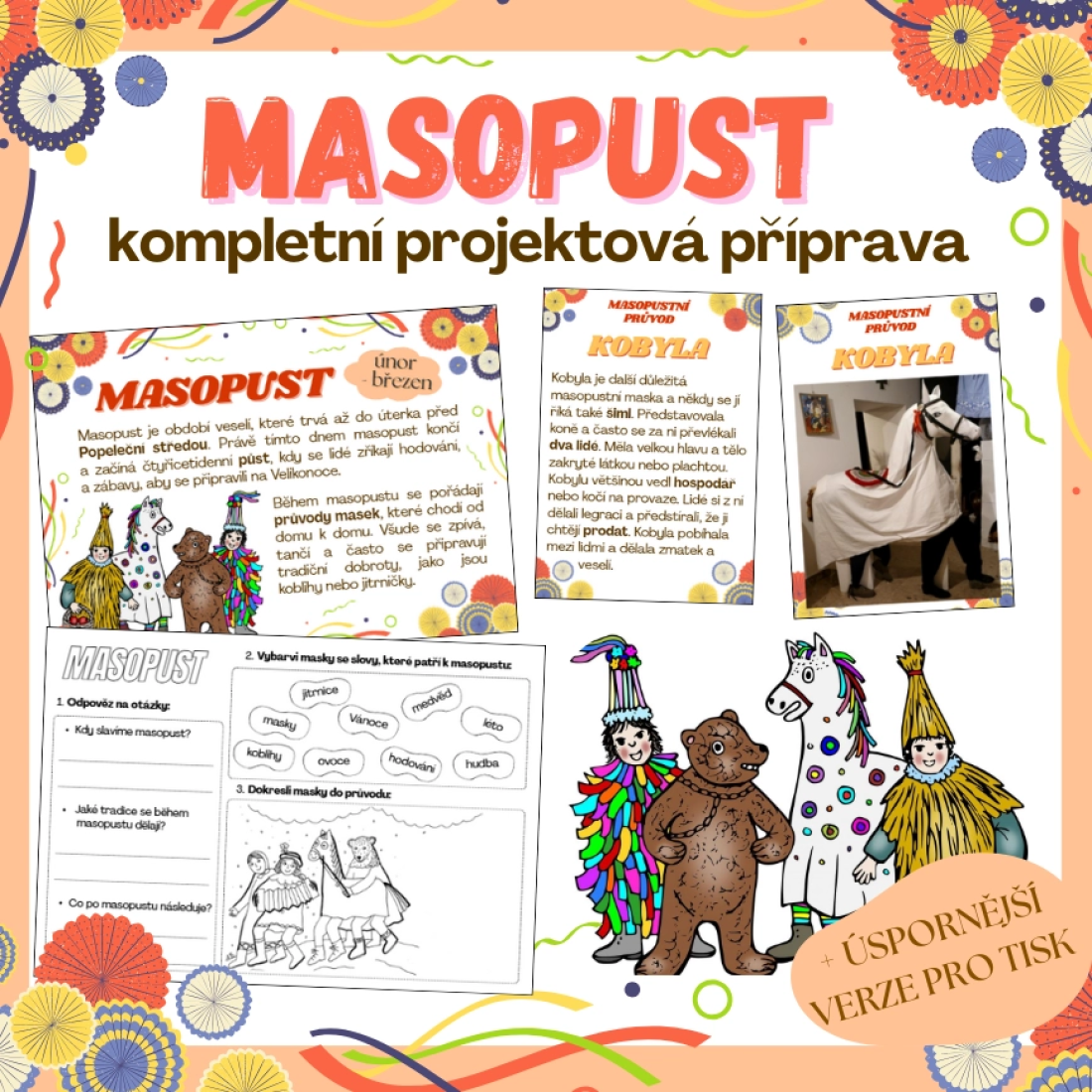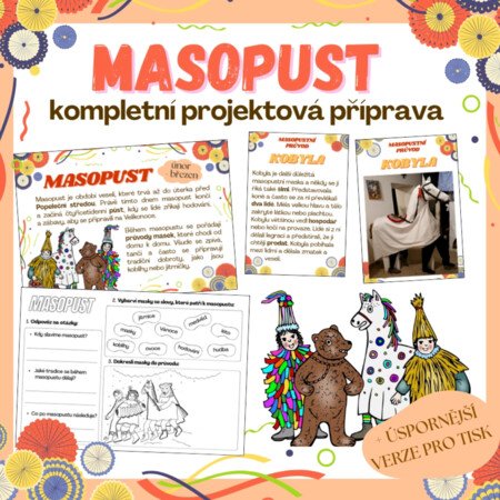 Projekt – materiál lze využít jako součást tematického dne masopust. Materiál je připraven tak, aby děti prakticky a zábavně procvičovaly český jazyk, prvouku a výtvarnou výchovu, zatímco se seznamují s českými lidovými zvyky a tradicemi.