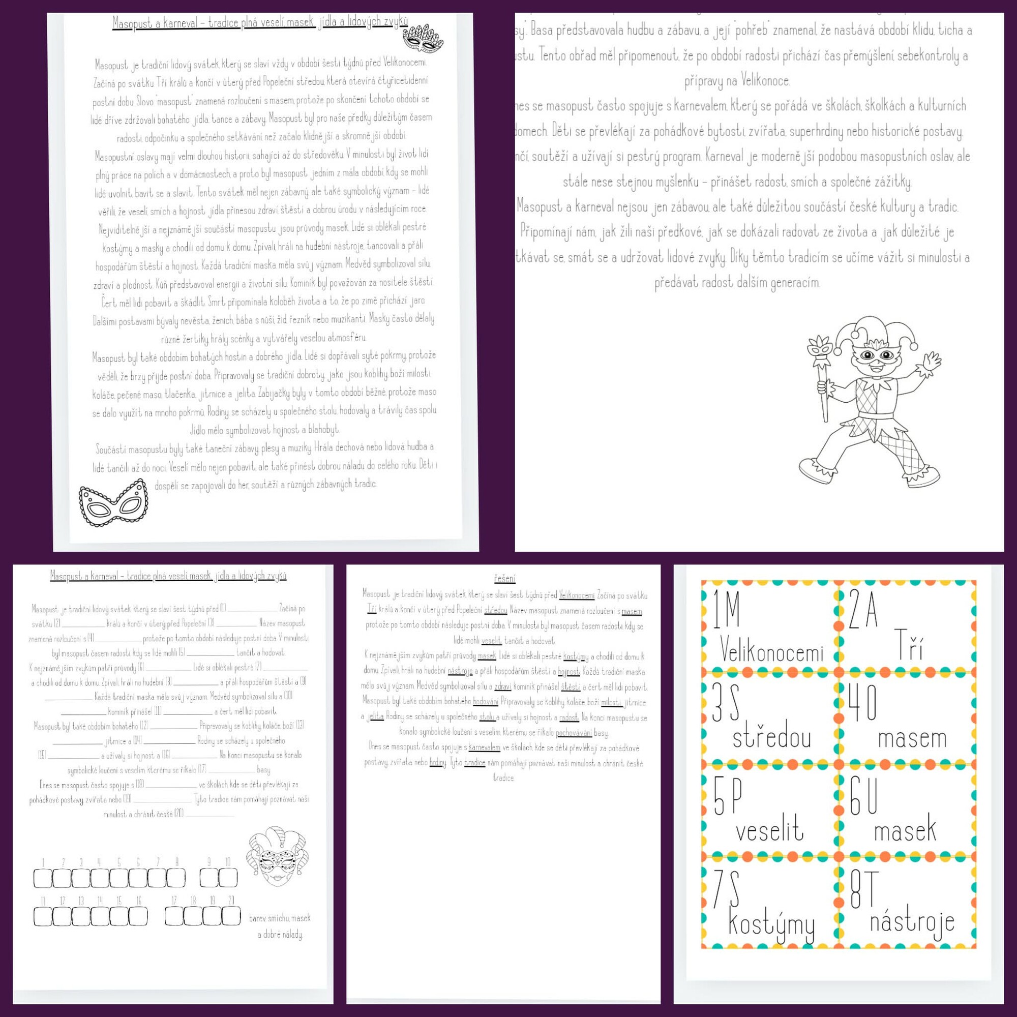 Tento výukový materiál je zaměřen na seznámení žáků s tradičním lidovým svátkem masopust a jeho významem. Slouží k rozvoji čtenářské gramotnosti, porozumění textu, práce se slovy a upevnění znalostí zábavnou a aktivní formou.