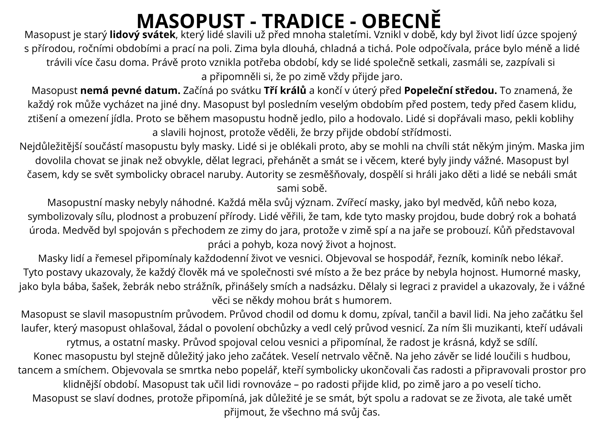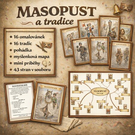 Soubor obsahuje 16 tradičních masopustních masek, se kterými se děti postupně seznamují. Najdete zde karty jednotlivých masek, minipříběhy, texty o tradicích, dějovou pohádku o masopustu, omalovánky, otázky