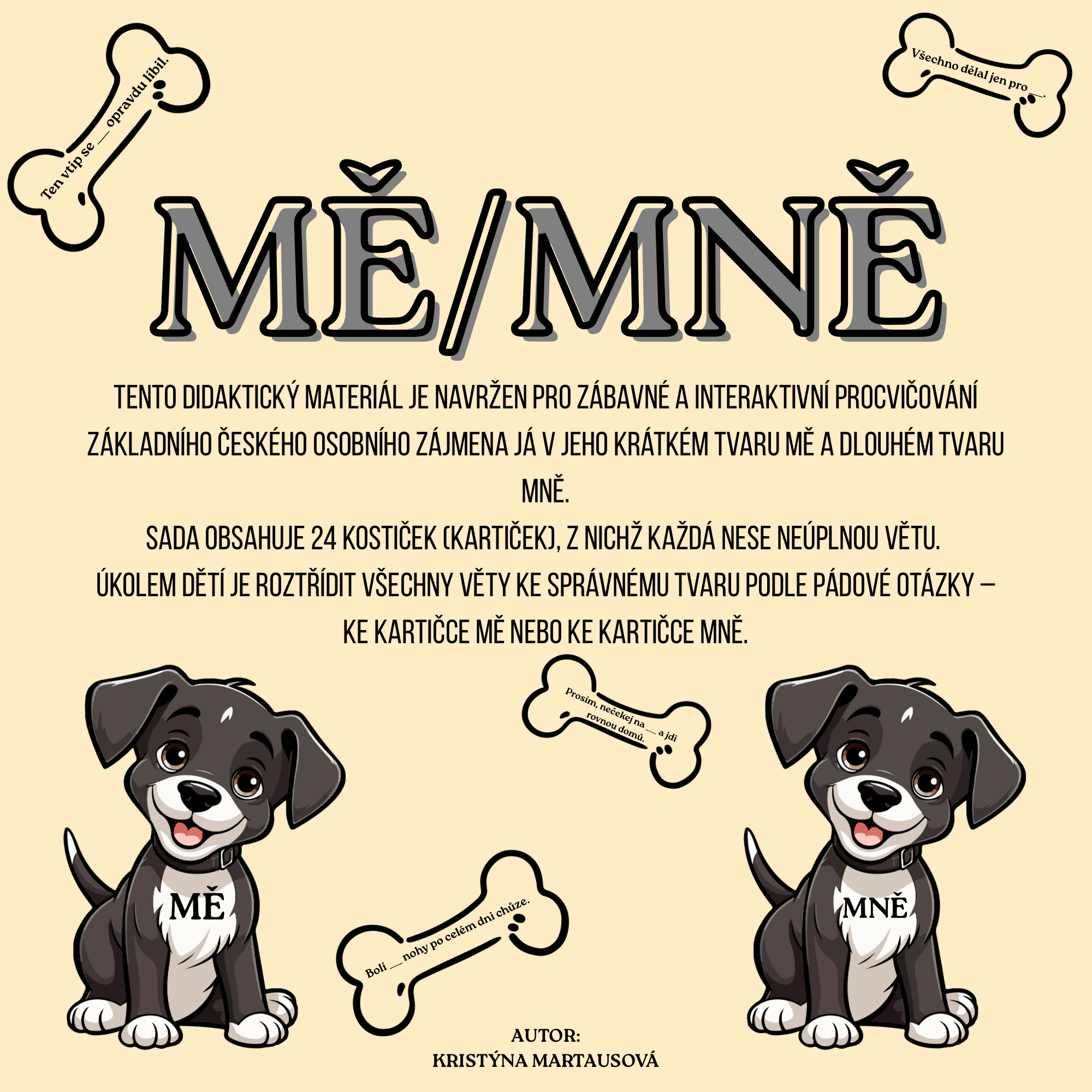 Sada obsahuje 24 kostiček (kartiček), z nichž každá nese neúplnou větu (např. Ten dárek je pro ___. nebo Pověz ___ to tajemství.). Úkolem dětí je roztřídit všechny věty ke správnému tvaru podle pádové otázky – ke kartičce MĚ (používá se pro pád 2 a 4) nebo ke kartičce MNĚ (používá se pro pád 3 a 6).