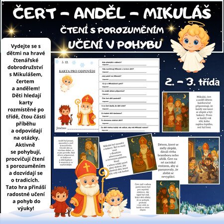 Tato pohybová a čtecí hra na téma Mikuláš, čert a anděl přináší do třídy 5. prosince kouzlo tradic a zábavu při učení. Hra je určena především pro žáky 2. až 4. třídy, kteří se při ní aktivně pohybují po třídě a zapojují se do čtení s porozuměním.