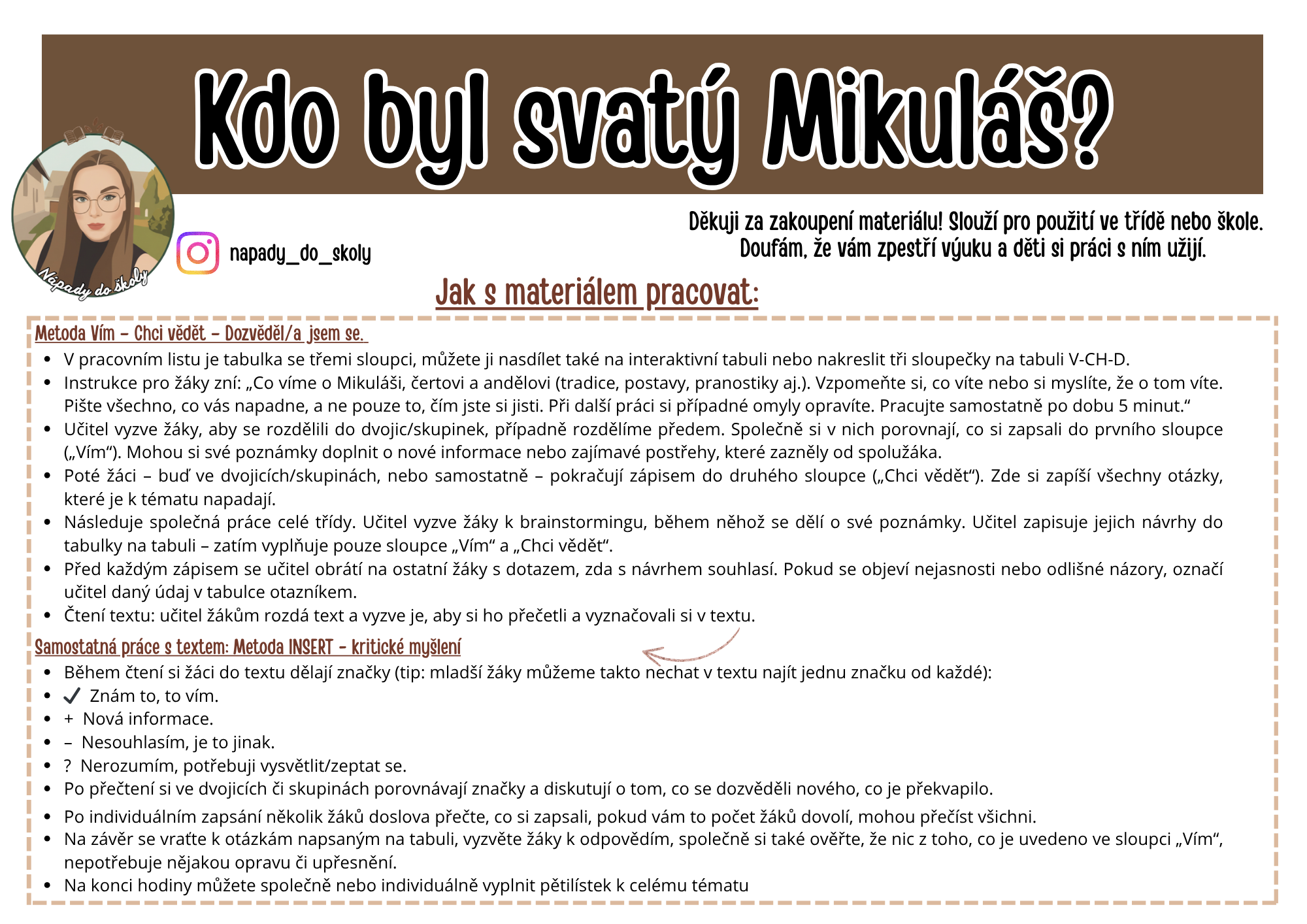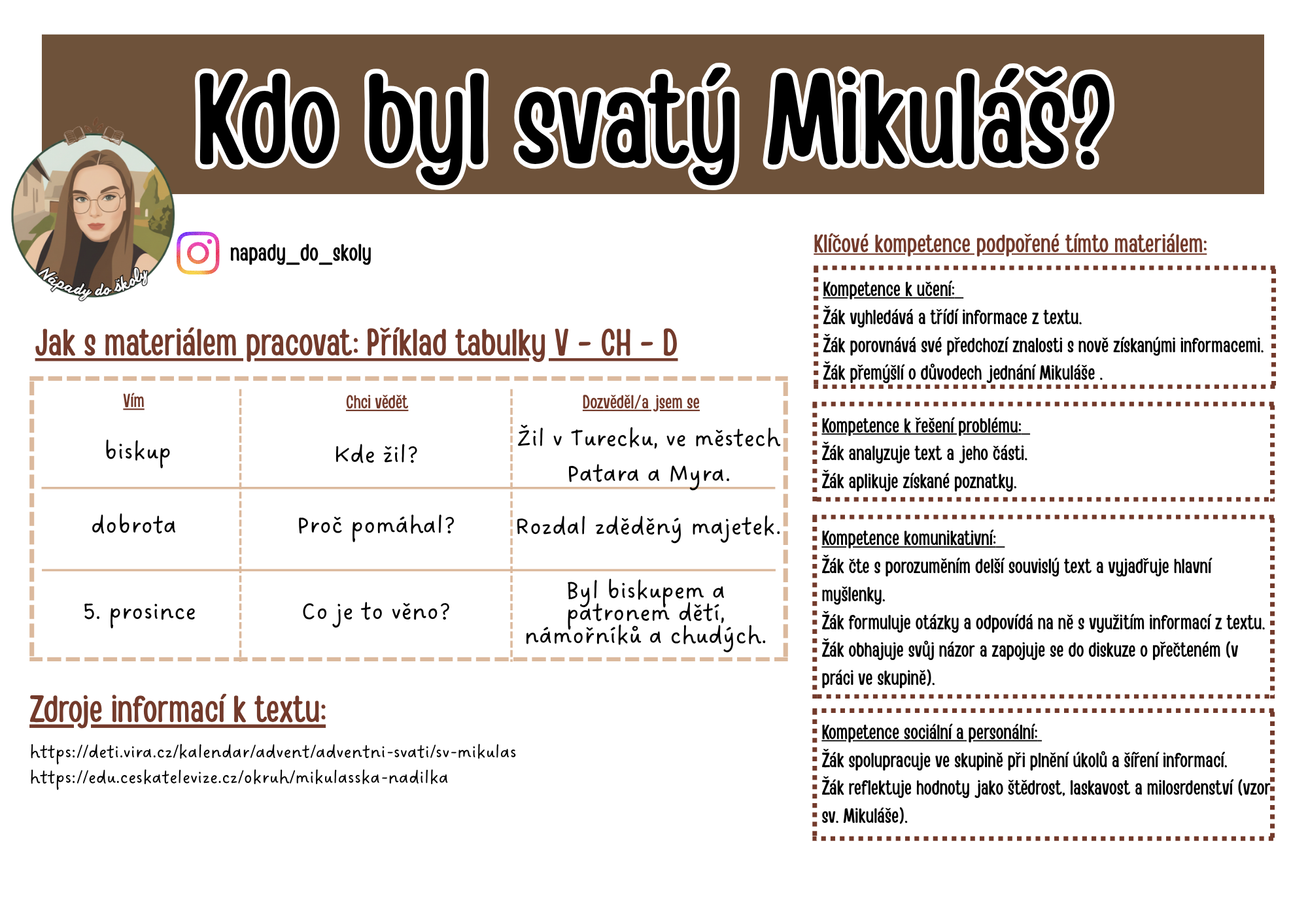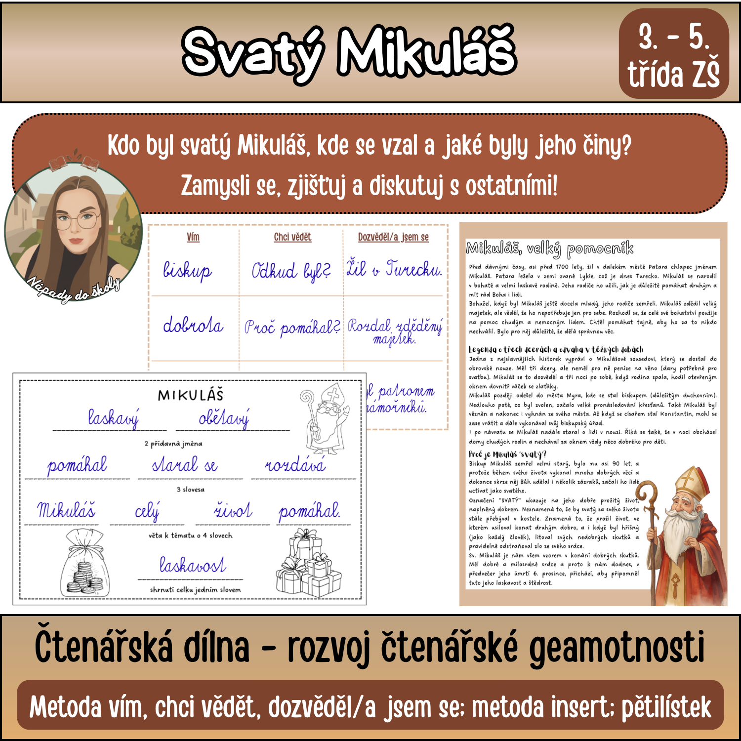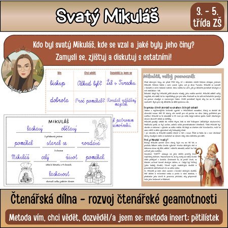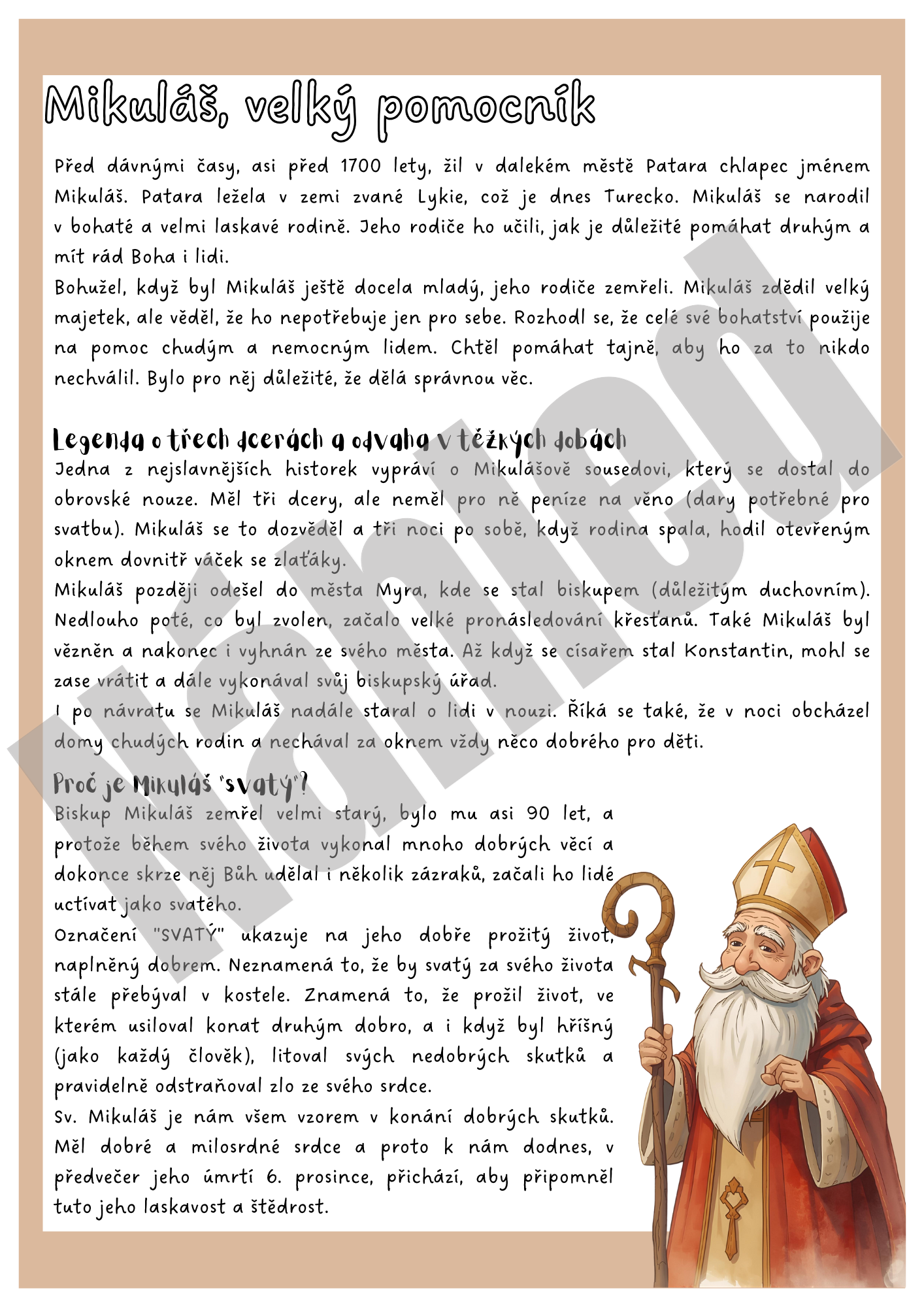 Čtenářský text "Kdo byl svatý Mikuláš?": Rozšířená legenda vhodná pro 3. - 5. třídu, která zahrnuje nejen slavný příběh o záchraně tří dcer, ale i historický kontext: