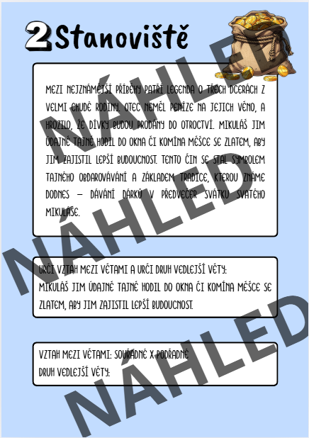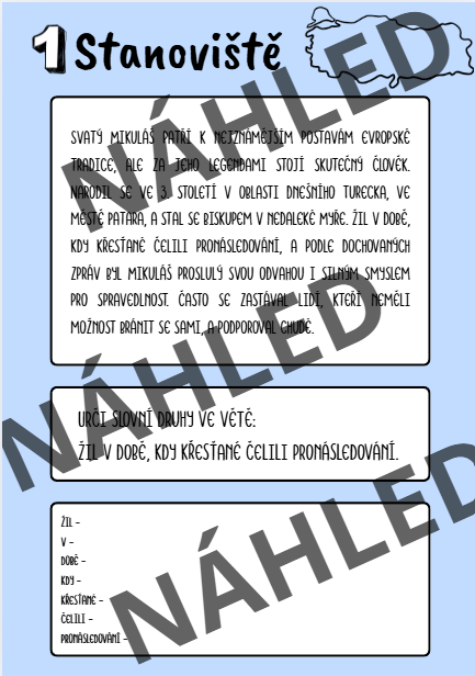Na prvním stanovišti žáci určí slovní druhy, na druhém určí vztah mezi větami a druh vedlejší věty. Na třetím stanovišti žáky čeká určit větné členy. Na čtvrtém stanovišti žáky potrápí mluvnické kategorie. Na pátém stanovišti se budou zabývat slovními přesmyčkami a na šestém stanovišti využijí kreativní myšlení a budou vymýšlet básničku a kreslit Mikuláše podle sebe.