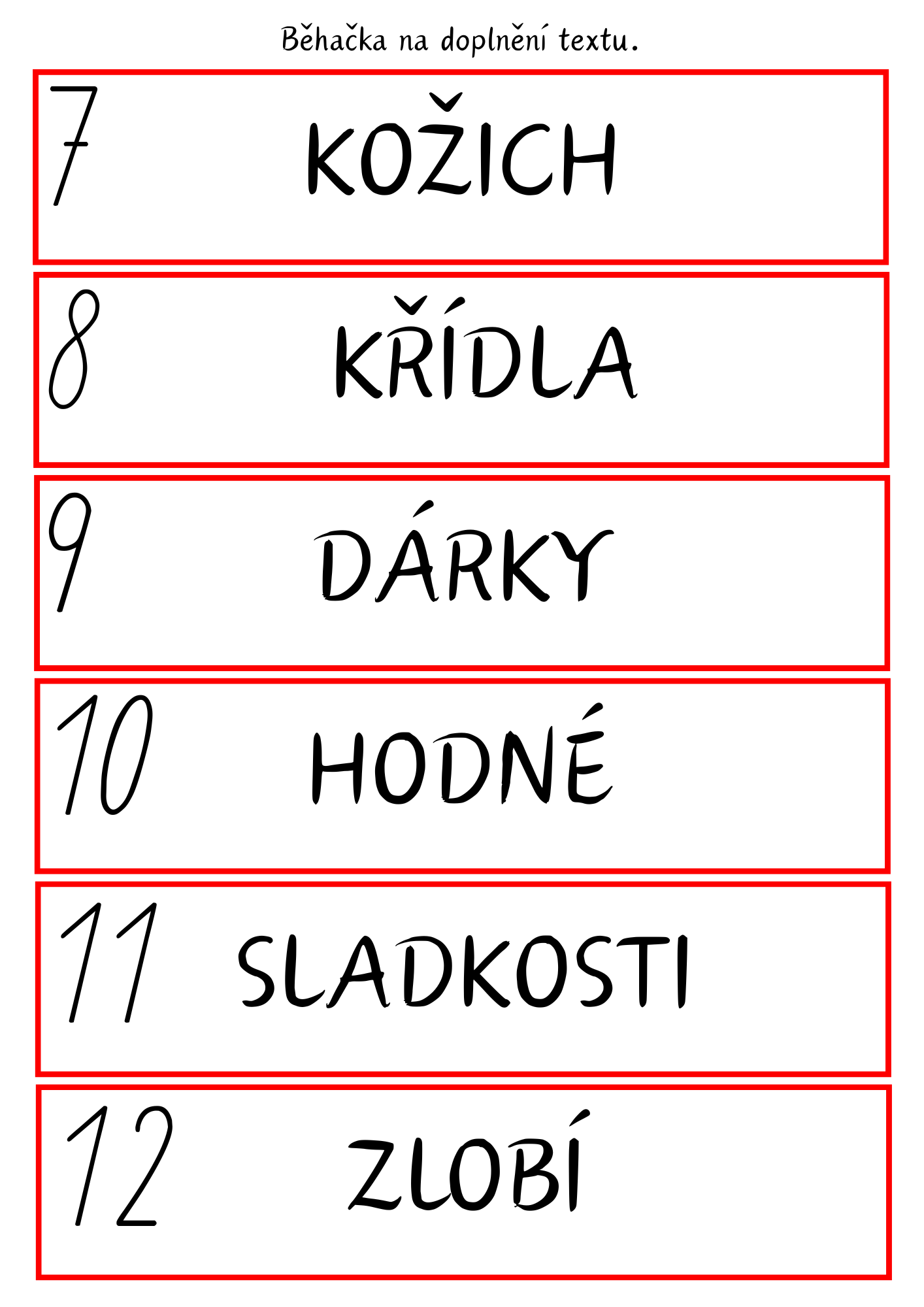 Děti doplňují chybějící slova do souvislého textu o tradiční Mikulášské nadílce. Slova hledají na kartičkách rozmístěných po třídě, což podporuje nejen čtení s porozuměním, ale i pohyb a spolupráci.
