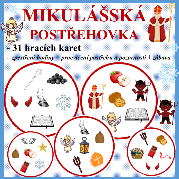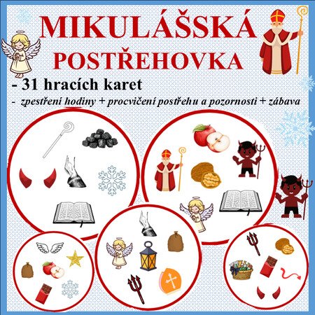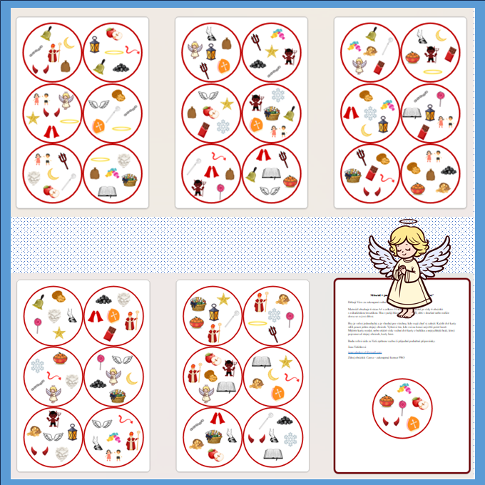 Materiál obsahuje 6 stran A4 s celkem 31 kartičkami na nichž je vždy 6 obrázků s mikulášskou tematikou. Hru využijí hlavně učitelé v MŠ, děti v družině nebo rodiče doma se svými dětmi.
