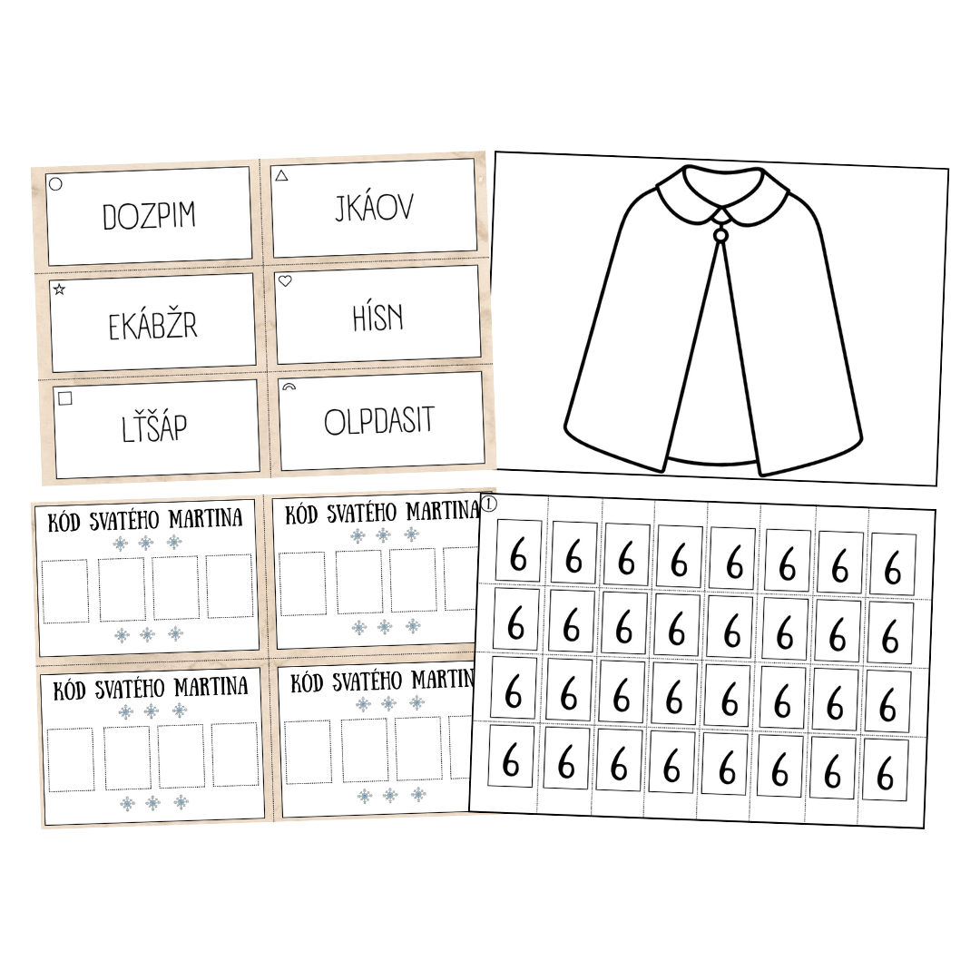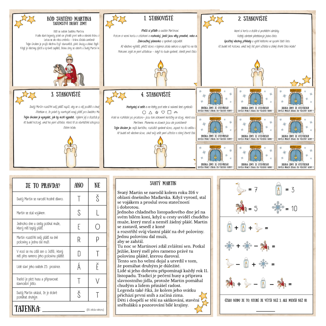 - Vytiskneme si karty se stanovišti a rozmísítme je po prostoru. Ke každému stanovišti dáme k dispozici listy, které k němu patří. Ke stanovišti 1. texty o sv. Martinovi a věty k textu, stanoviště 2 - listy s příklady, stanoviště 3 - pláště, stanoviště 4 - přesmyčky schováme po prostoru tak, aby je děti byly schopny najít