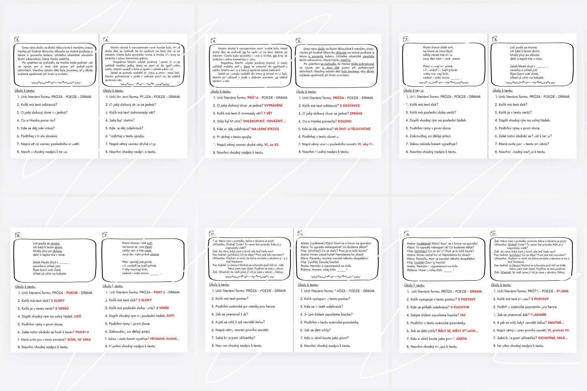 Každý pracovní list obsahuje krátký text (próza, poezie nebo drama) a navazující úkoly.