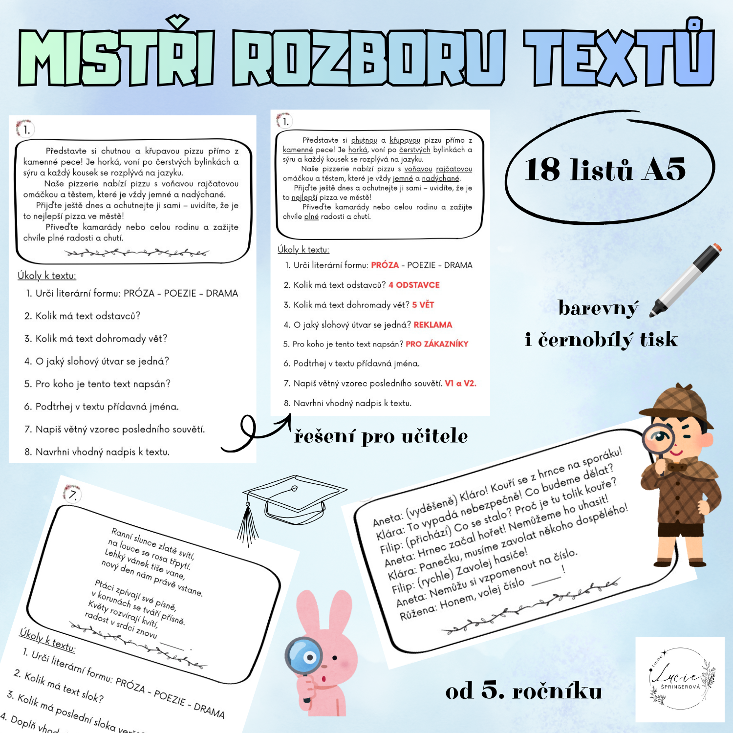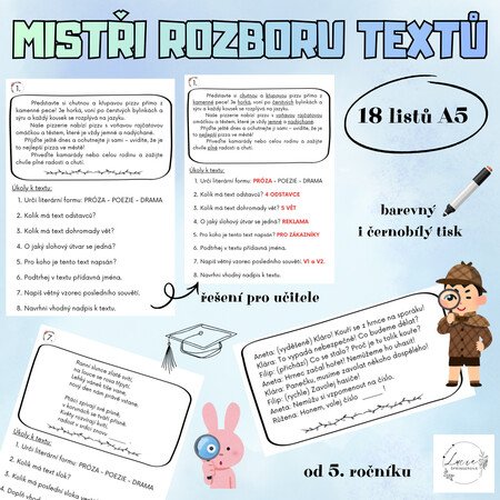 18 pracovních listů, které jsou zaměřeny na rozvoj čtenářské gramotnosti, porozumění textu a jazykového rozboru
