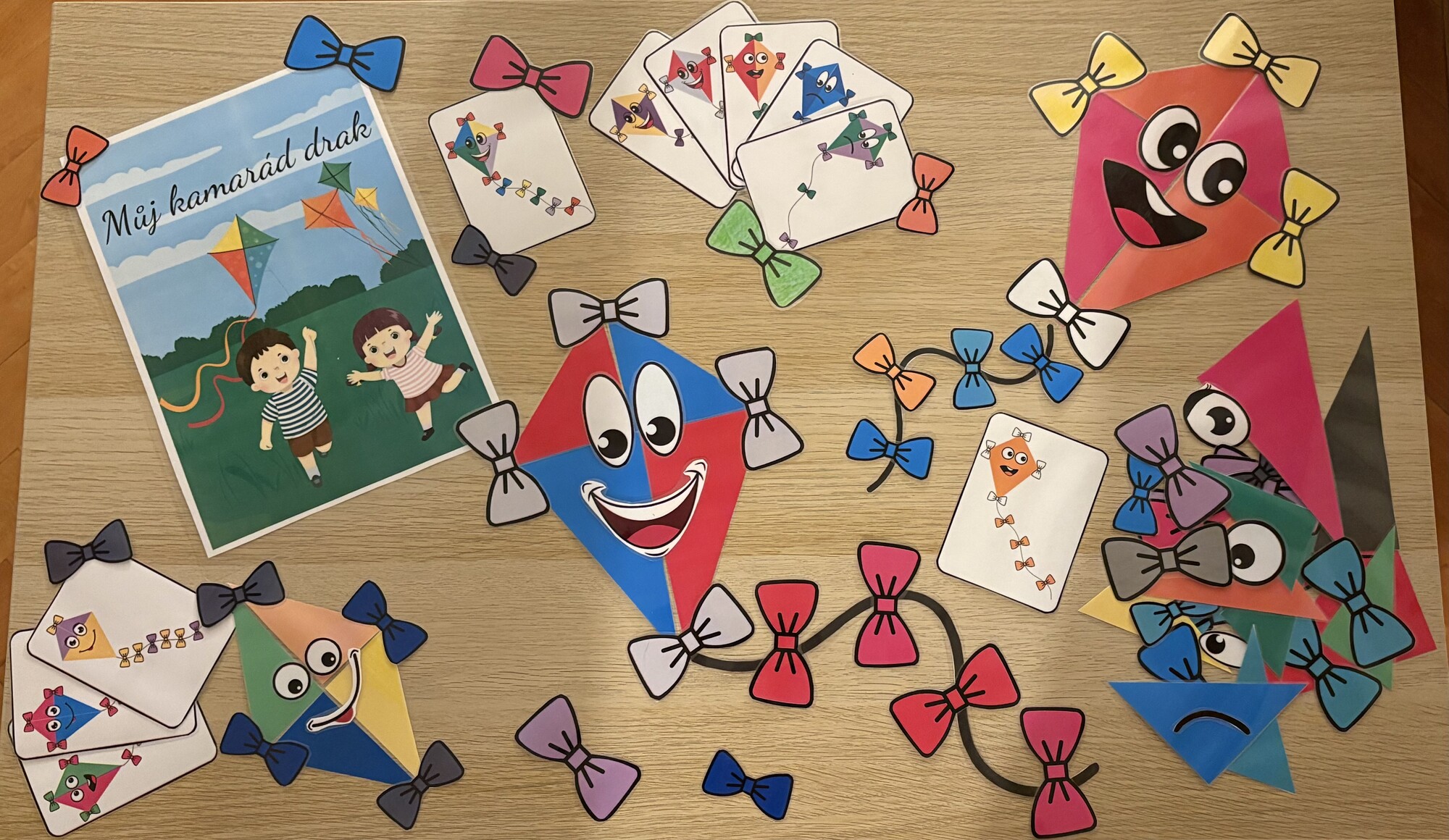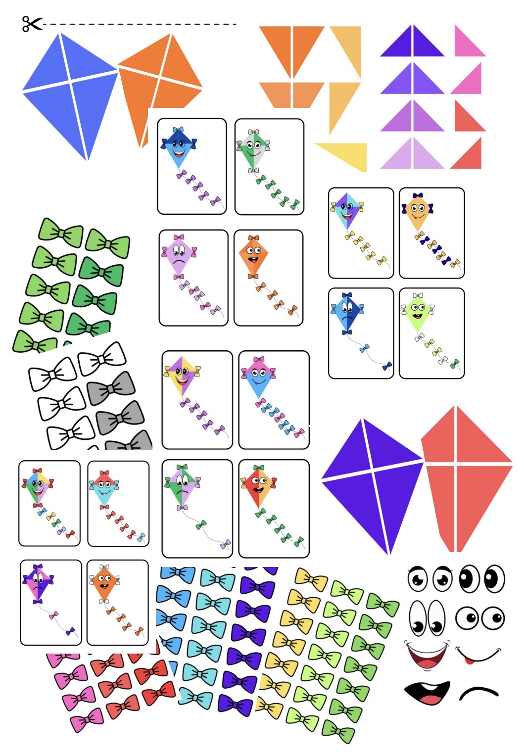 Soubor obsahuje barevné díly pro skládání draků ve dvou velikostech. Děti mají k dispozici:
