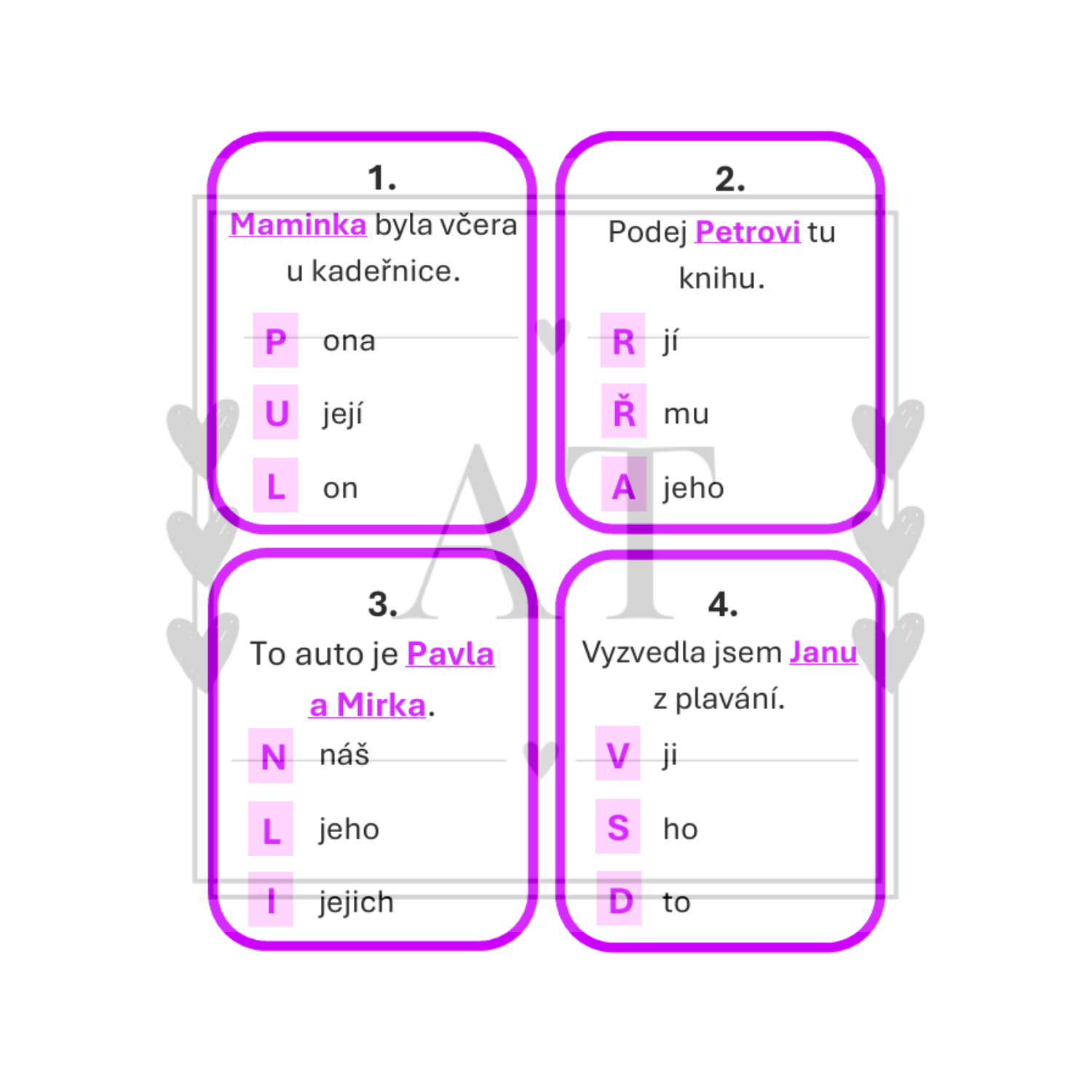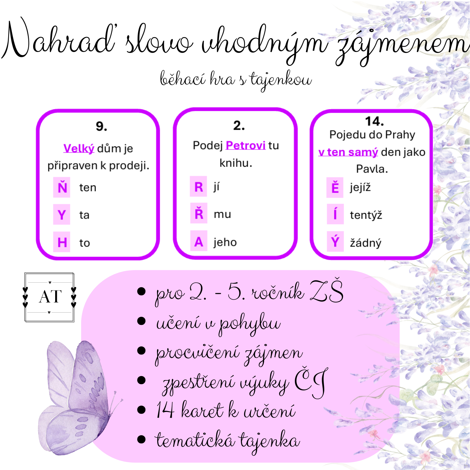 Pohybová hra zaměřená na nahrazování slov ve větách vhodnými zájmeny. Úkolem žáka je vybrat vhodné zájmeno z nabídky a nahradit jím zvýrazněné slovo ve větě. Po doplnění všech zájmen žákům vyjde tematická tajenka, kterou si budou zapisovat k přiloženému pracovnímu listu. K pomůcce je přiložen také pracovní list k doplňování a kontrolka k pracovnímu listu. Soubor obsahuje celkem 14 vět. Ideální k rychlému procvičení učiva.