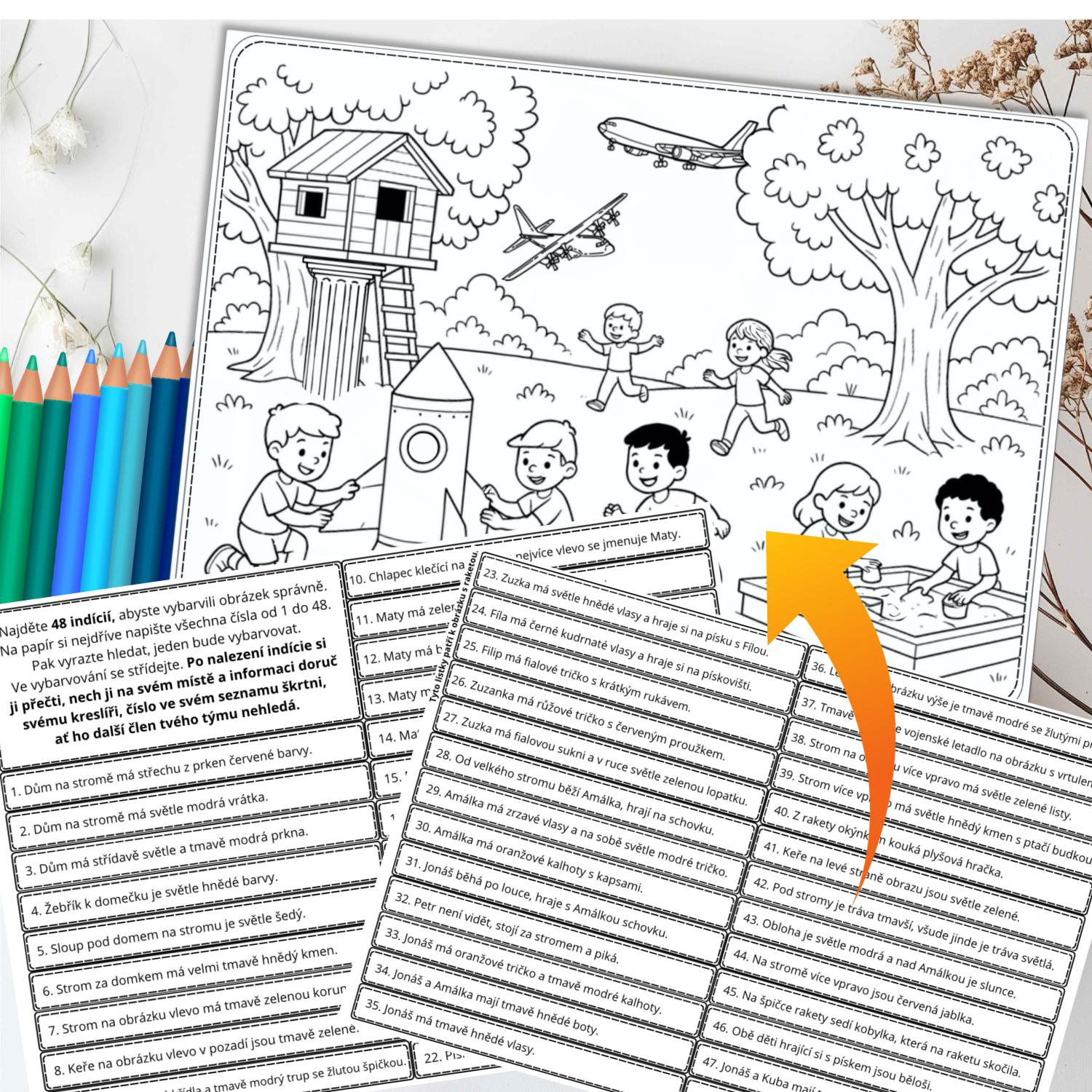 Tento materiál obsahuje tři tematické obrázky doplněné indiciemi a krátkými popisy, které žáky vedou k aktivnímu čtení a pozornému vnímání textu. Děti hledají správné „papírky“ s popisy na obrázcích, porovnávají informace, čtou s porozuměním a následně vybarvují správné části ilustrací podle toho, co našly. Výsledkem je nejen procvičení čtení, ale i radost z viditelného pokroku na papíře.