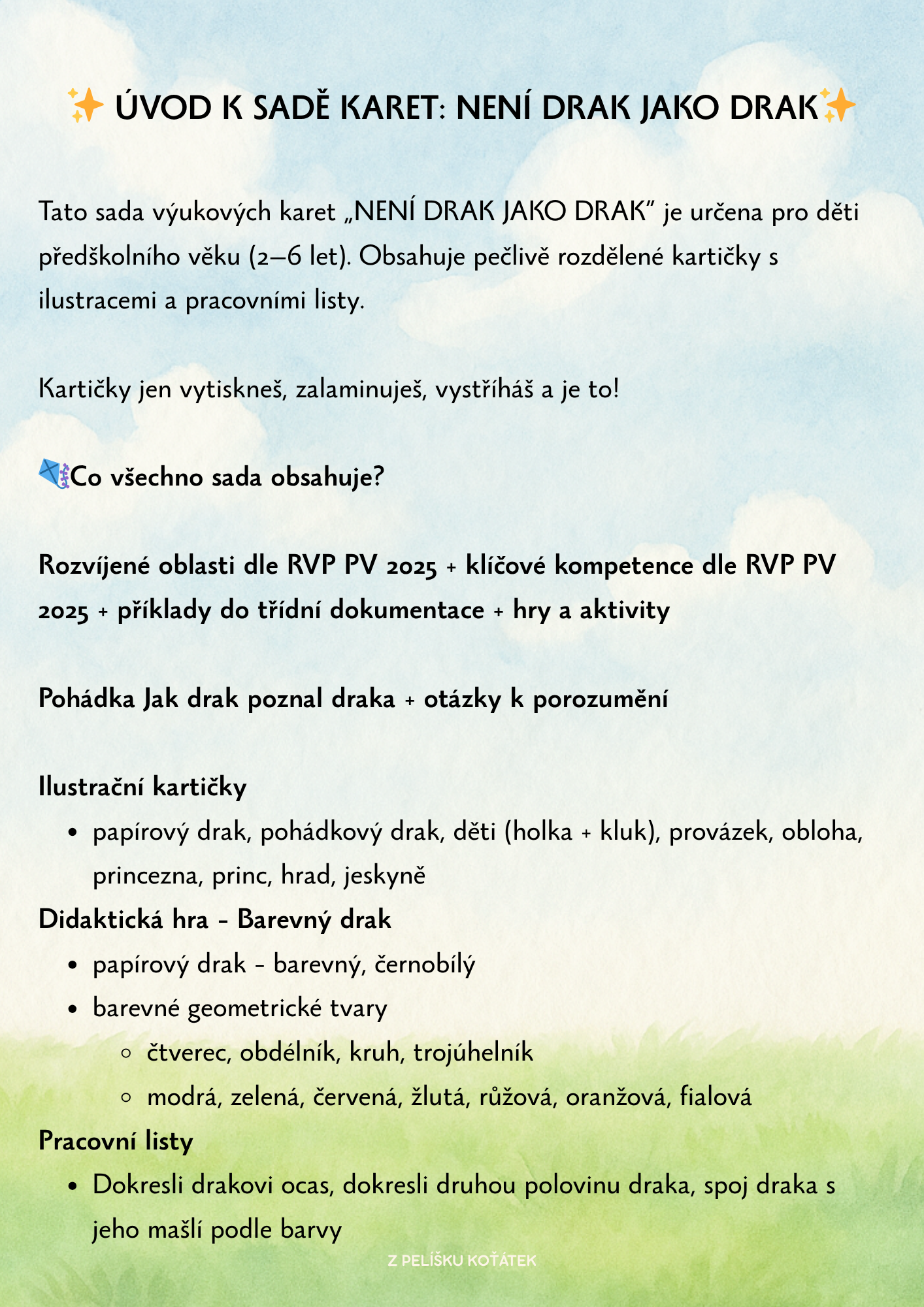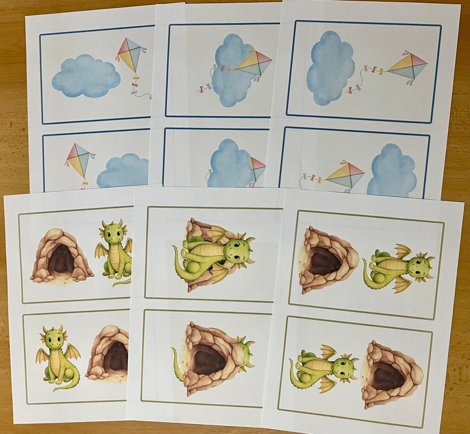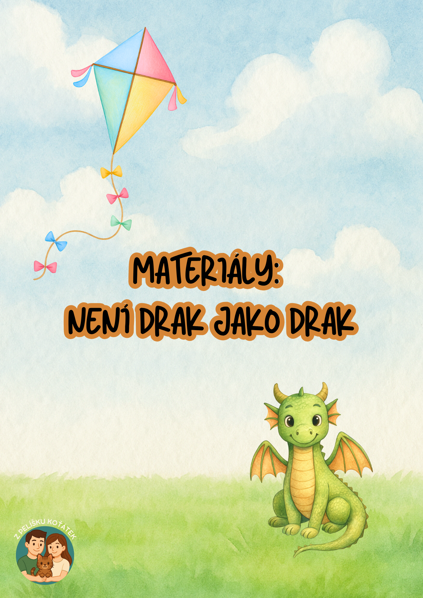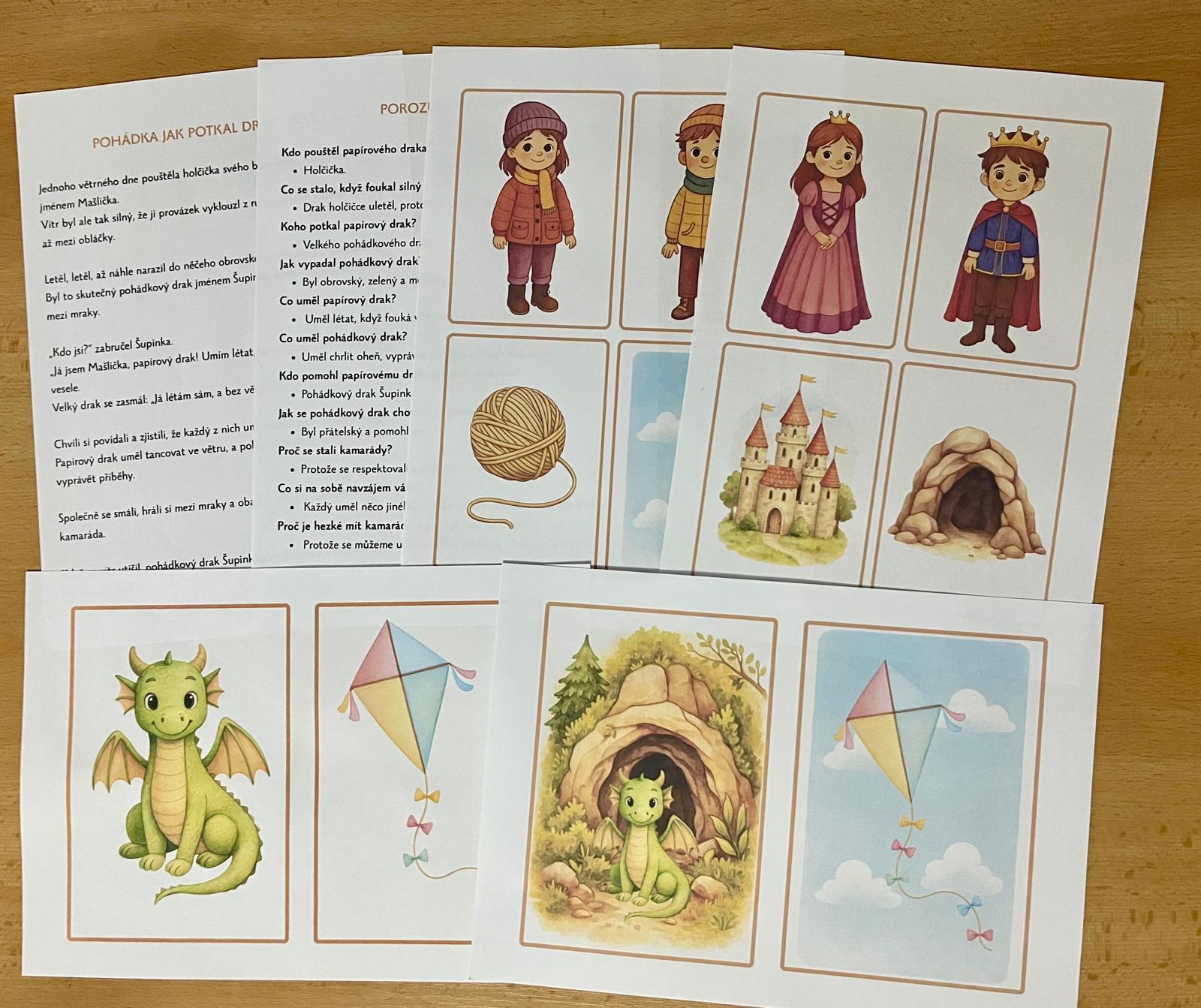 - papírový drak, pohádkový drak, děti (holka + kluk), provázek, obloha, princezna, princ, hrad, jeskyně