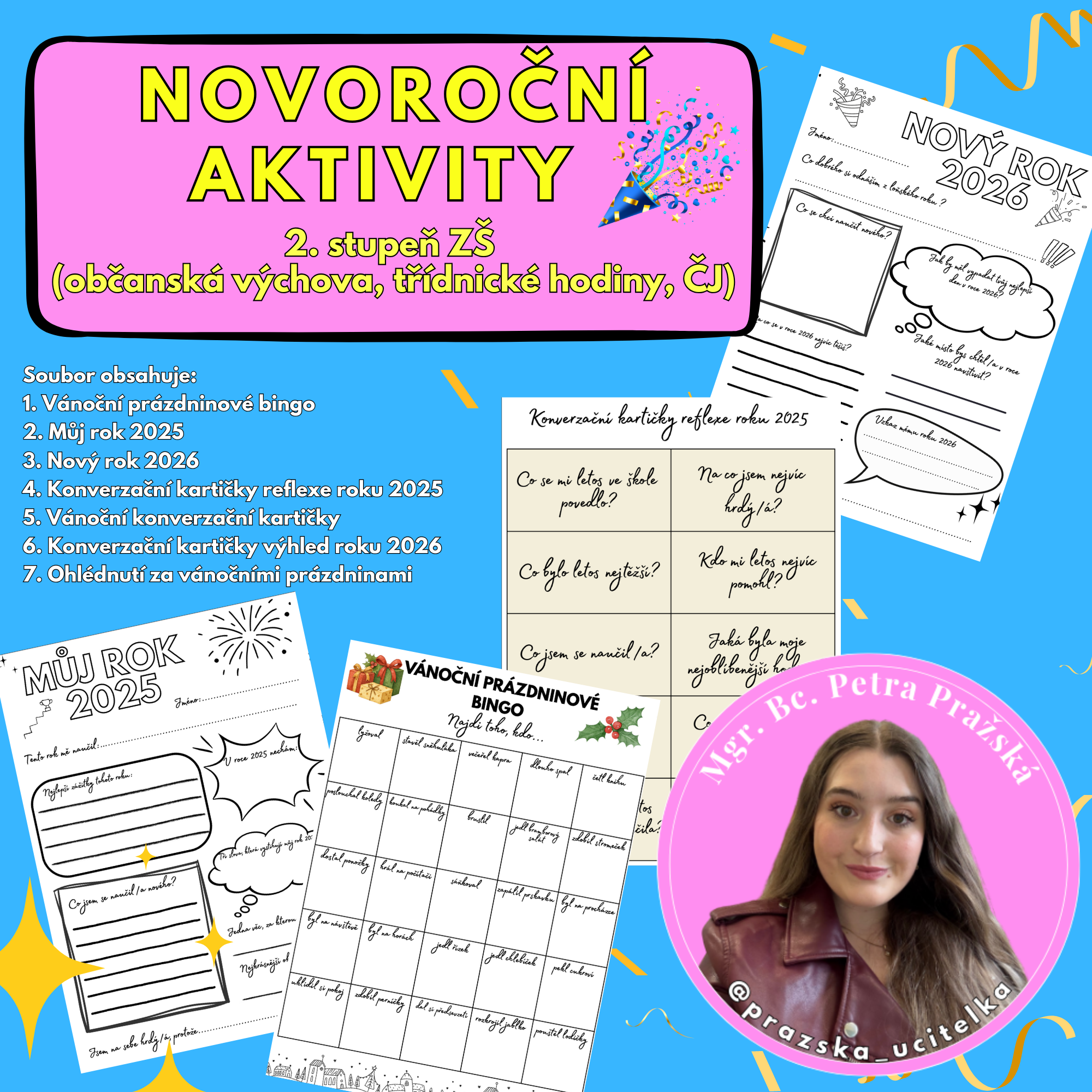 Tento materiál nabízí sadu novoročních aktivit ideálních na začátek nového roku. Lze je využít v jakémkoli předmětu, během třídnických hodin nebo jako rychlou úvodní aktivitu do hodiny. Jednotlivé části můžete používat samostatně, kombinovat je podle potřeby nebo zařadit postupně během celého ledna.