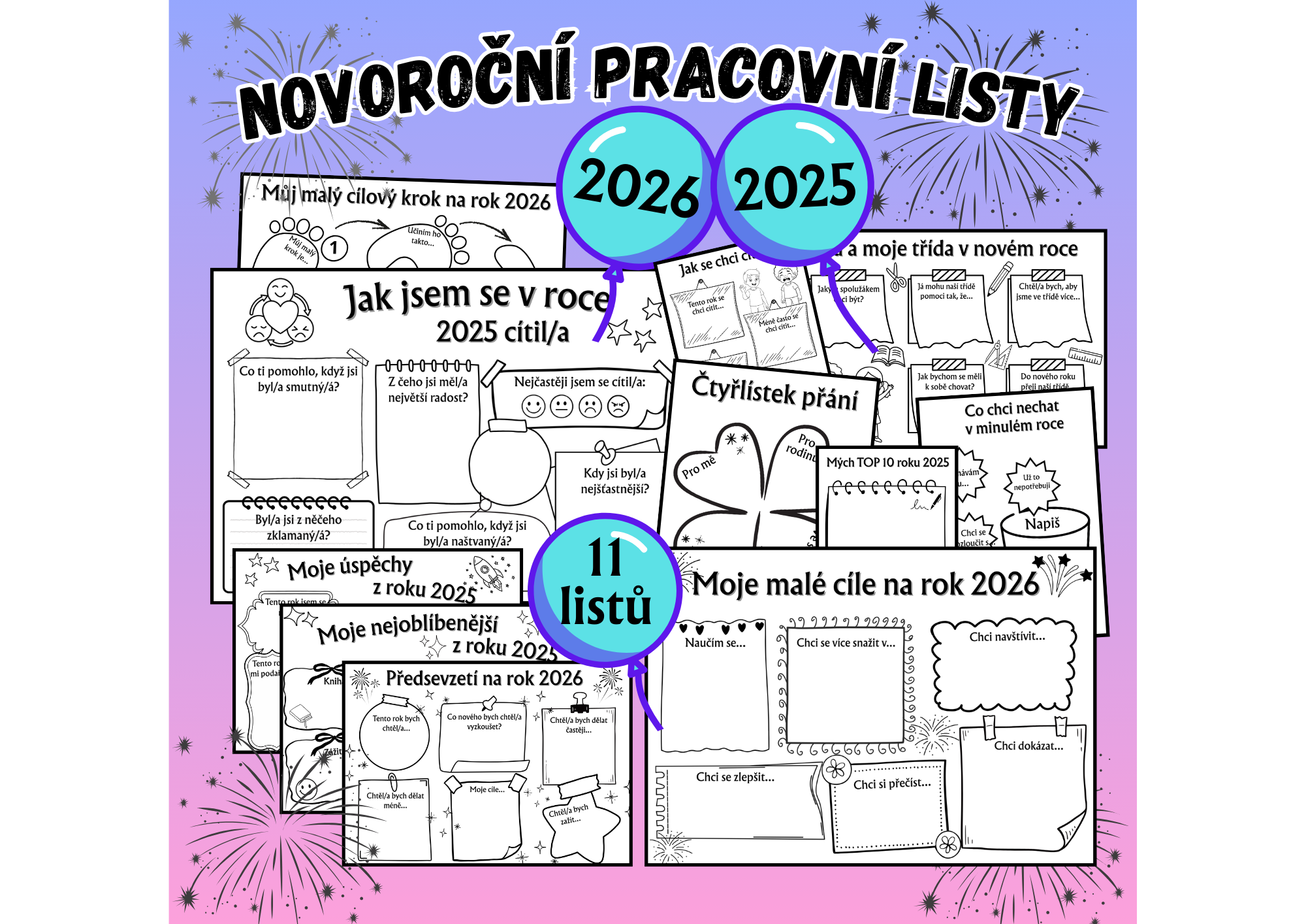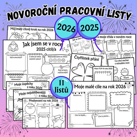 Motivační sada pracovních listů, která pomáhá žákům reflektovat uplynulý rok a plánovat cíle a předsevzetí do nového roku. Obsahuje 11 listů, do kterých si děti mohou zapisovat: