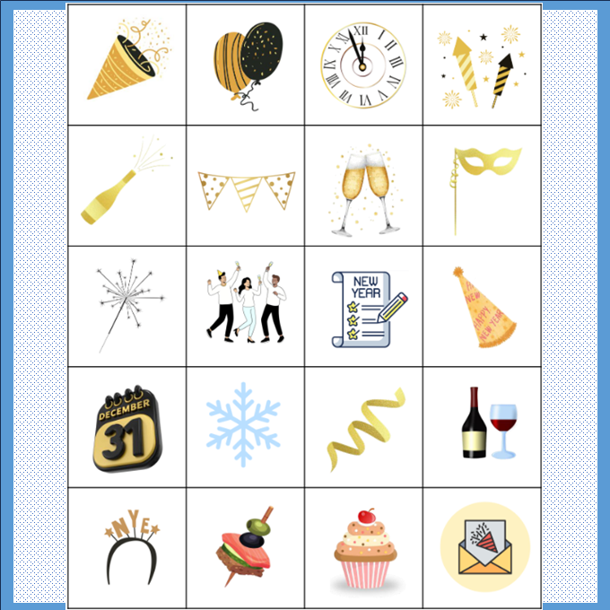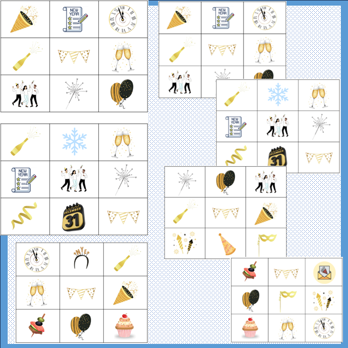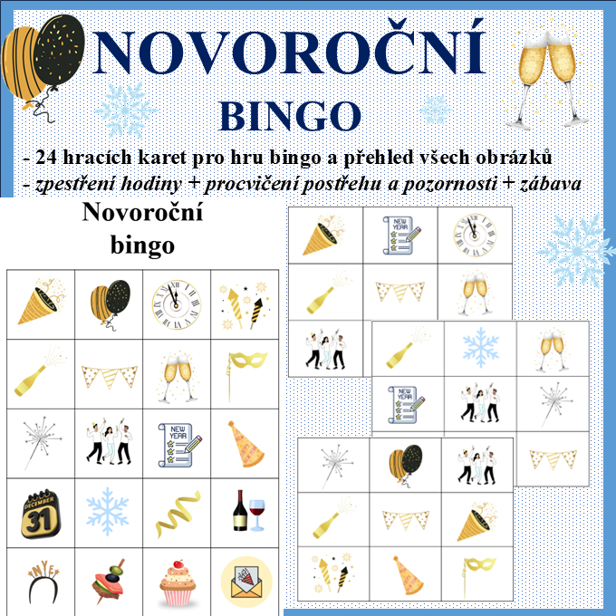 - 24 hracích karet (2 karty na jednom listu) s obrázky na téma Silvestr a Nový rok