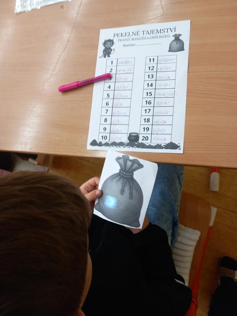 Najít všech 20 pytlů, prosvítit je, rozluštit obrázková slova a zapsat je do své hrací karty nebo sešitu.