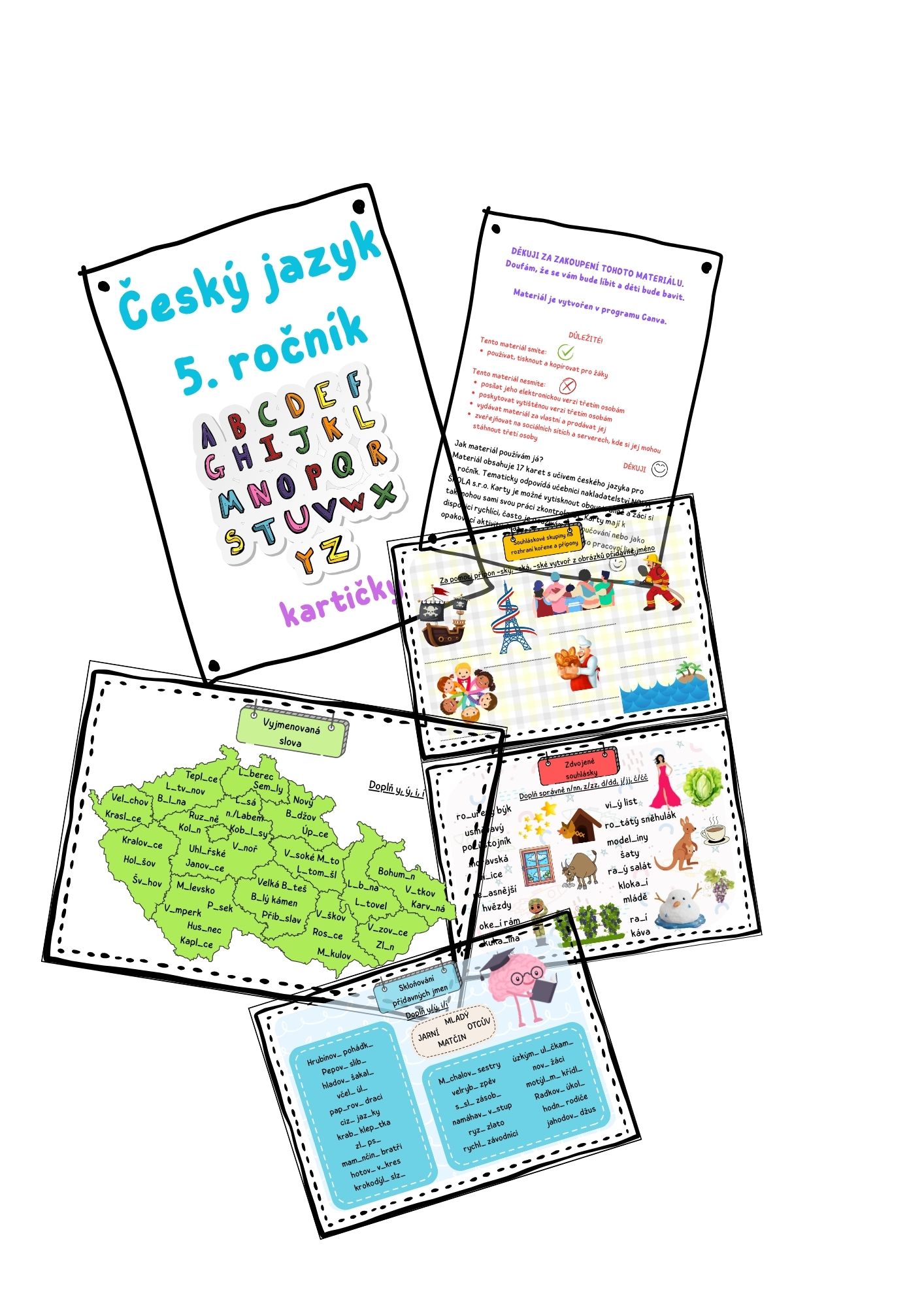 Materiál obsahuje 17 karet/34 kartiček s učivem českého jazyka pro 5. ročník. Tematicky odpovídá učebnici nakladatelství NOVÁ ŠKOLA s.r.o. Karty je možné vytisknout oboustranně a žáci si tak mohou sami svou práci zkontrolovat. Karty mají k dispozici rychlíci, často je používám při doučování nebo jako opakovací aktivitu na začátku hodiny. Materiál lze použít jako pracovní listy.