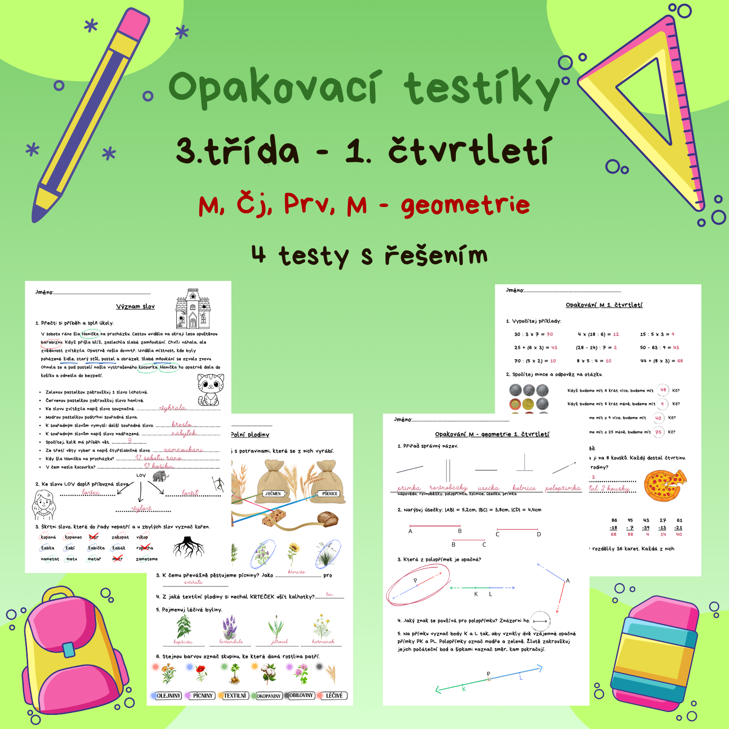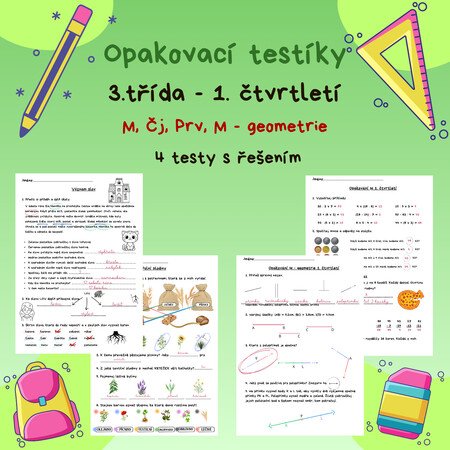 4 typy testů lze využít jako opakovací testy v hodinách matematiky, českého jazyka a prvouky. Testy jsou vypracovány tak, aby je zvládli vyplnit žáci v 1. čtvrtletí 3. třídy.