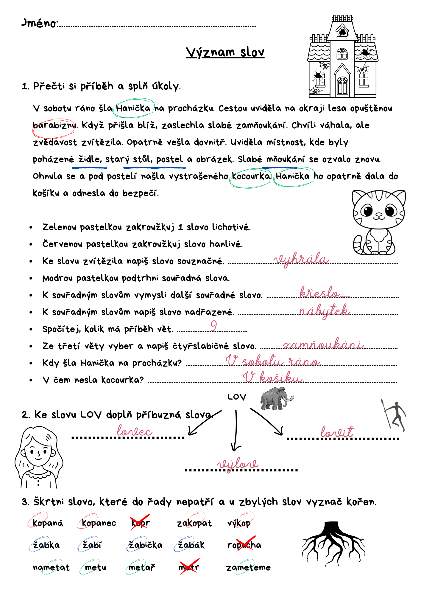 - ČJ - význam slov - práce s textem, slova citově zabarvená, nadřazená, podřazená, souřadná, slova příbuzná, kořen slova.