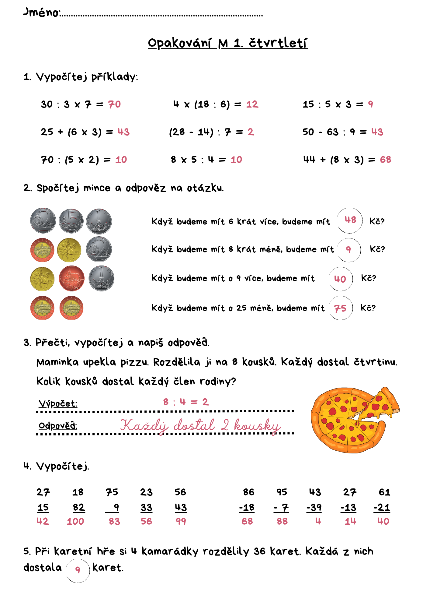 - M - násobení, dělení, sčítání a odčítání dvojciferných čísel, slovní úlohy, pojmy x krát více, méně a o x méně, více.