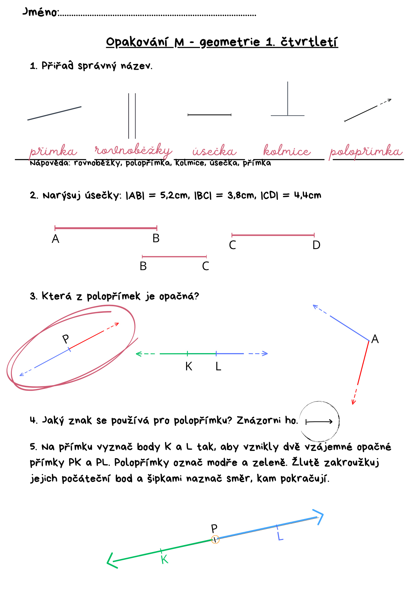 - Geometrie - přímka, úsečka, rýsování, polopřímky opačné.