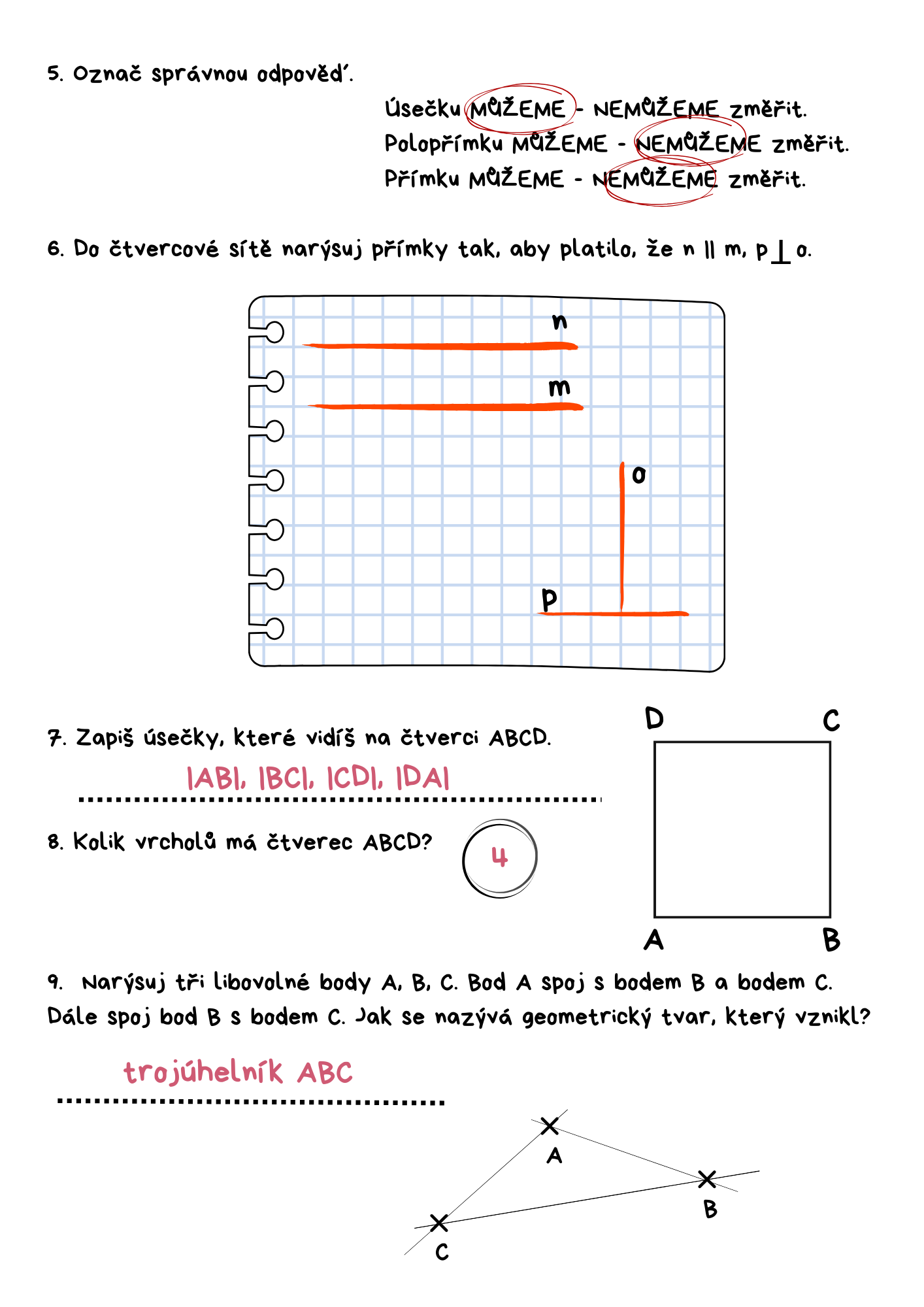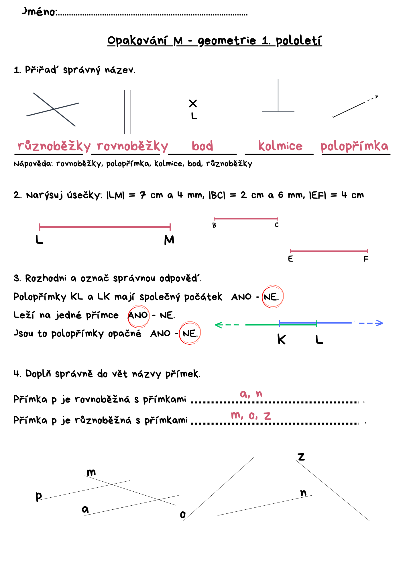 Geometrie - přímka, úsečka, rýsování a měření, polopřímky opačné, vzájemná poloha přímek.