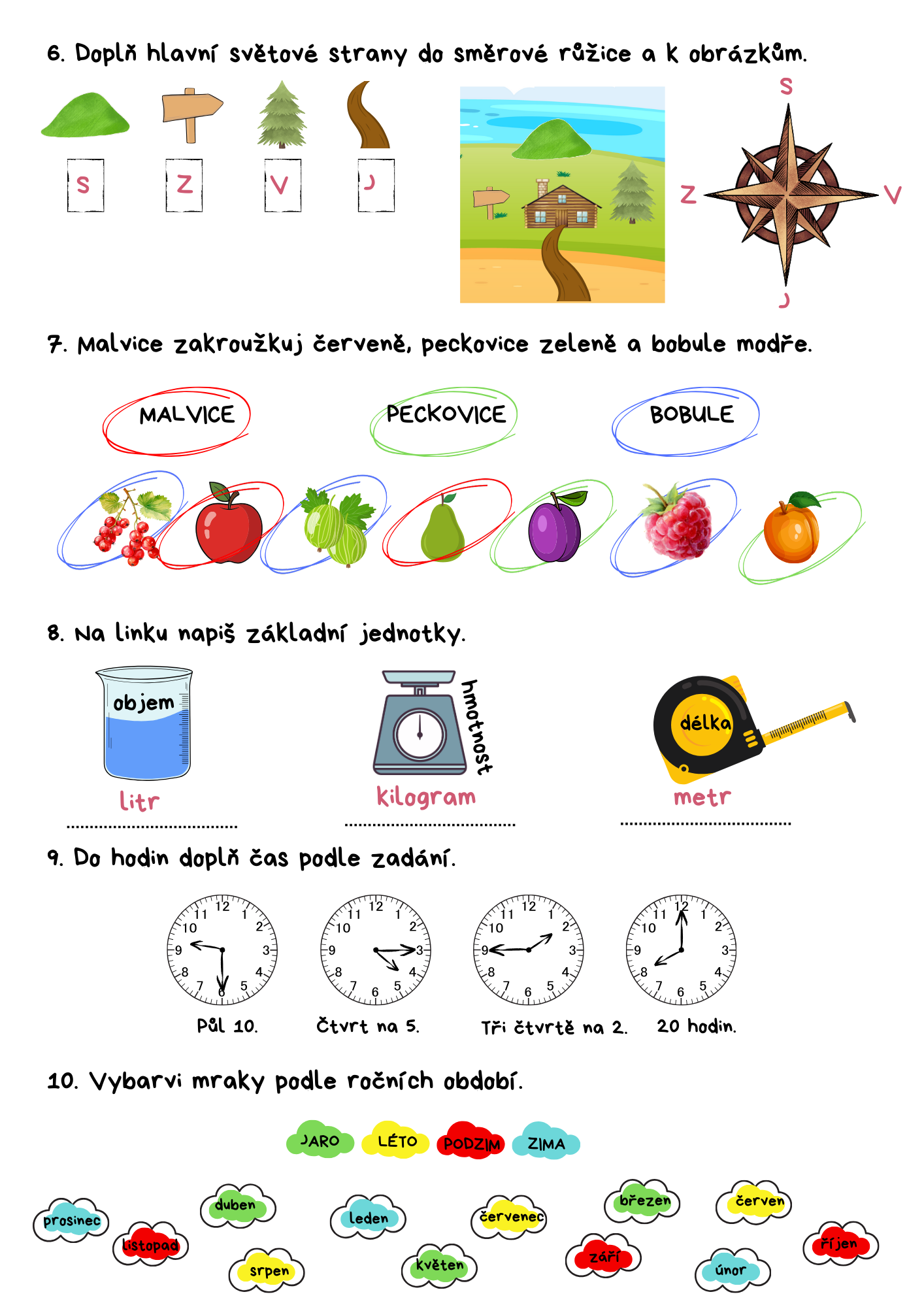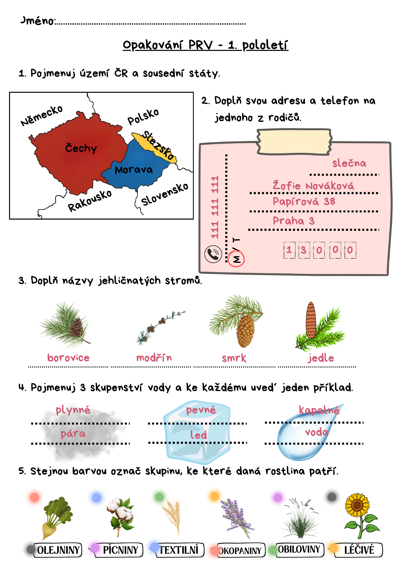 PRV - ČR a sousední státy, adresa, polní plodiny, ovoce, jehličnaté stromy, měsíce v roce, hodiny, jednotky délky, objemu a hmotnosti, skupenství vody, určování světových stran.
