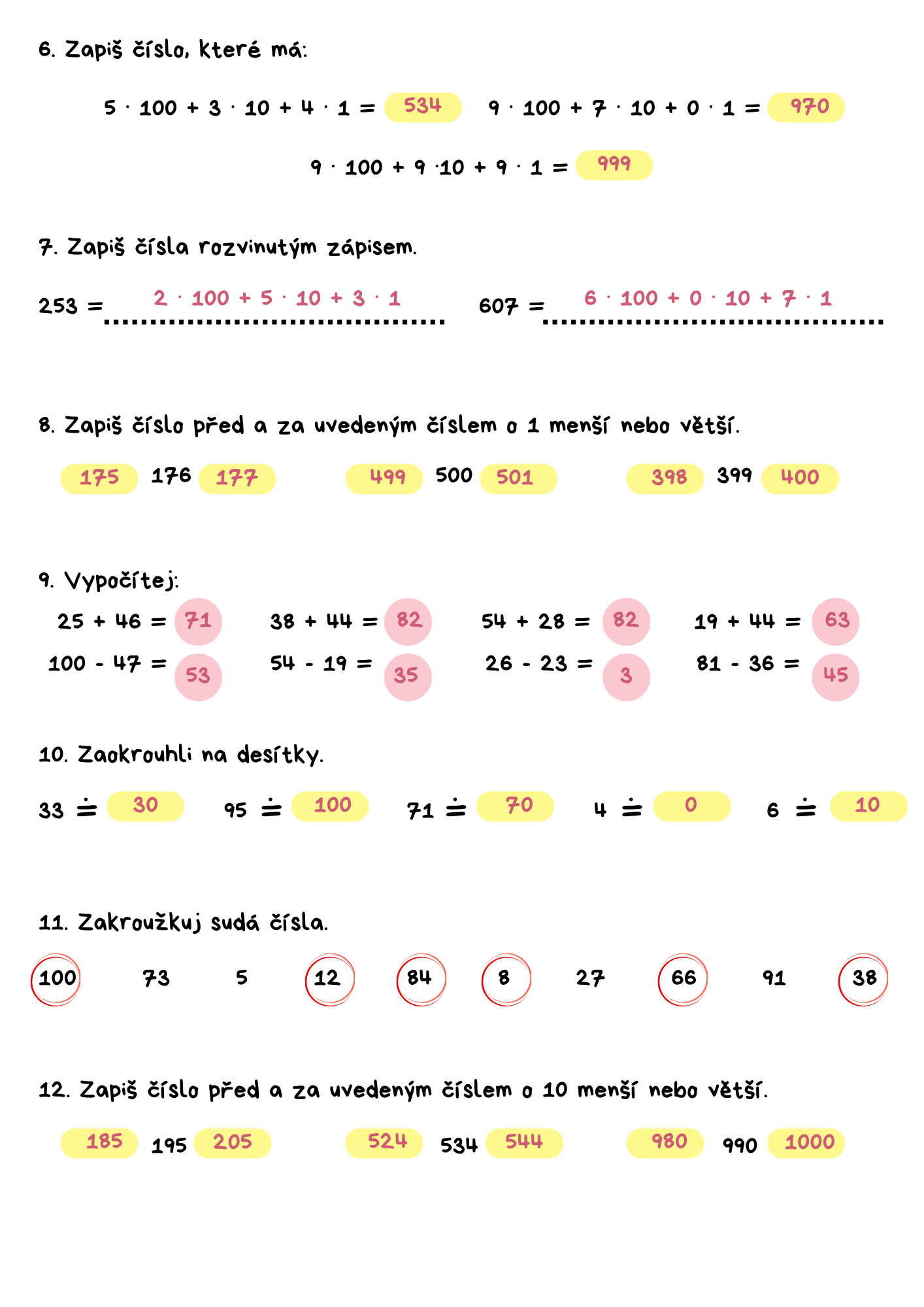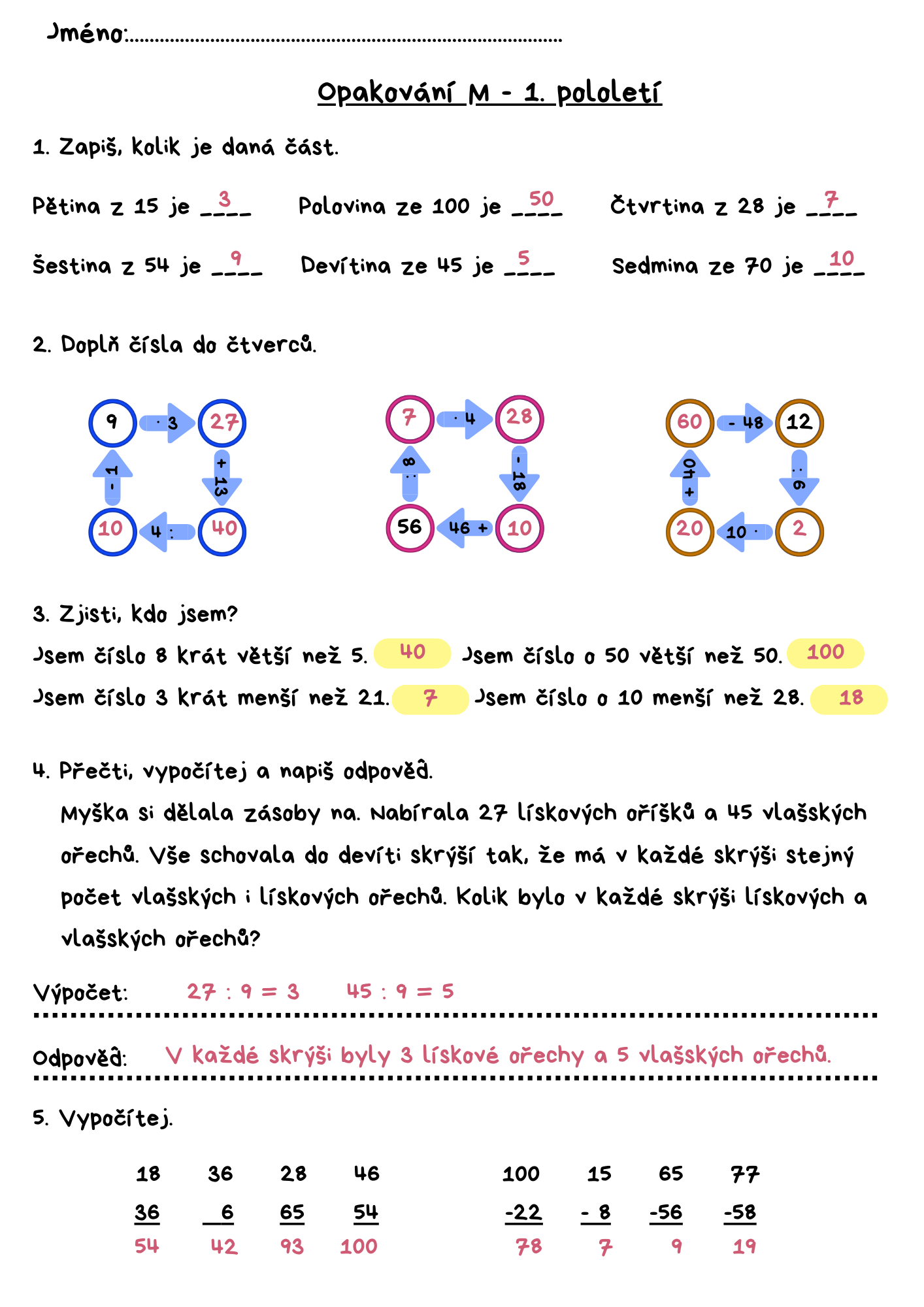 M - násobení, dělení, pamětné i písemné sčítání a odčítání dvojciferných čísel, slovní úlohy, pojmy x krát více, méně a o x méně, více, zaokrouhlování, numerace v oboru do 1000, sudá a lichá čísla.