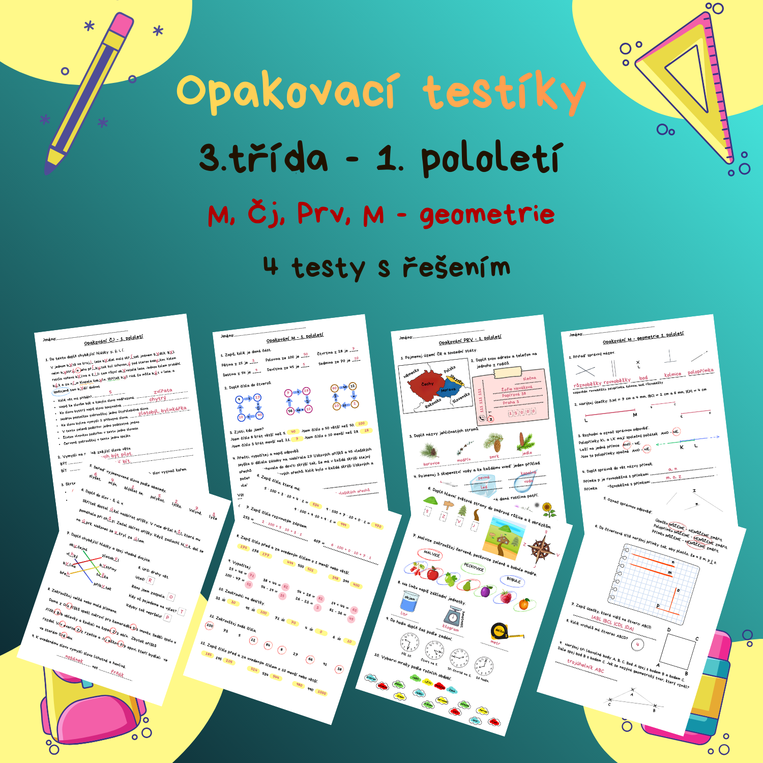 4 typy testů lze využít jako opakovací testy v hodinách matematiky, českého jazyka a prvouky. Testy jsou vypracovány tak, aby je zvládli vyplnit žáci v 1. pololetí 3. třídy.