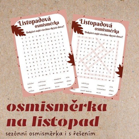 V souboru najdete jednu osmisměrku s listopadovou tématikou. Můžete si s ní zkrátit chvíle čekání na adventní dobu, která se už blíží. V balíčku je pro vás připraven 1 list s osmisměrkou a 1 s řešením.