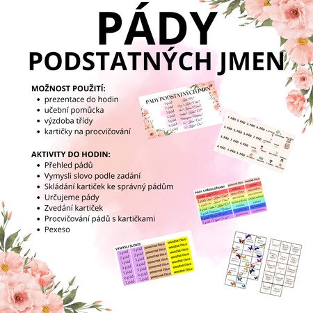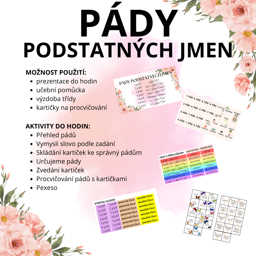 Hravé trénování a procvičování pádů. Pexeso, kartičky, diktát, pohyb, tvorba vět, určování pádů, a spousta dalších možností, jak materiál využít.