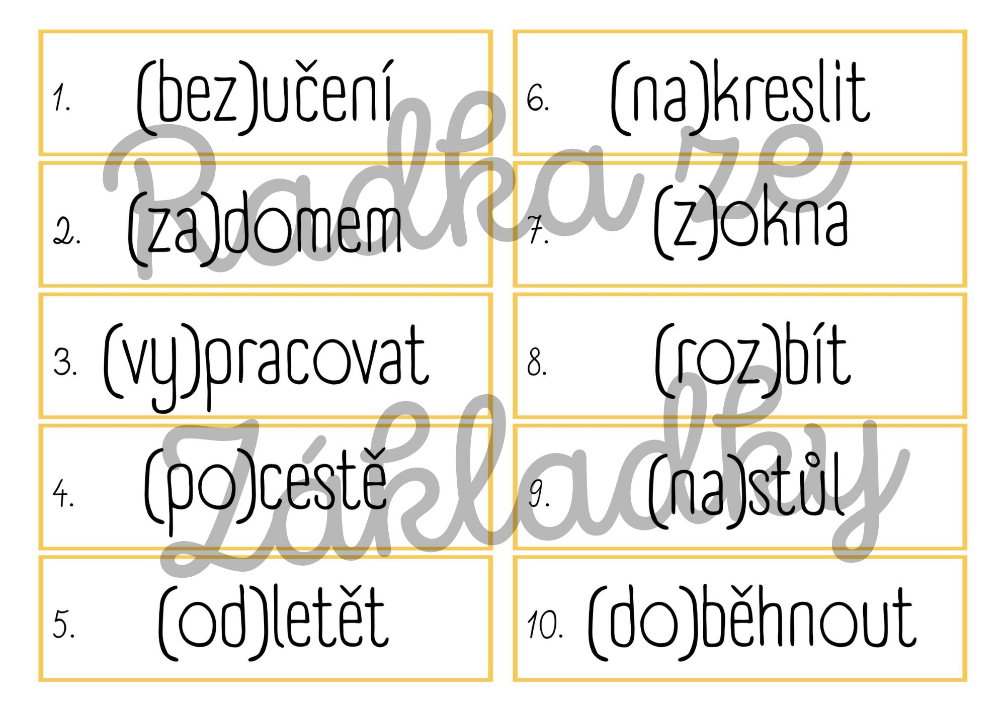 - Slova jsou uvedena ve stejném formátu (např. (po)cestě, (roz)bít, (za)domem).