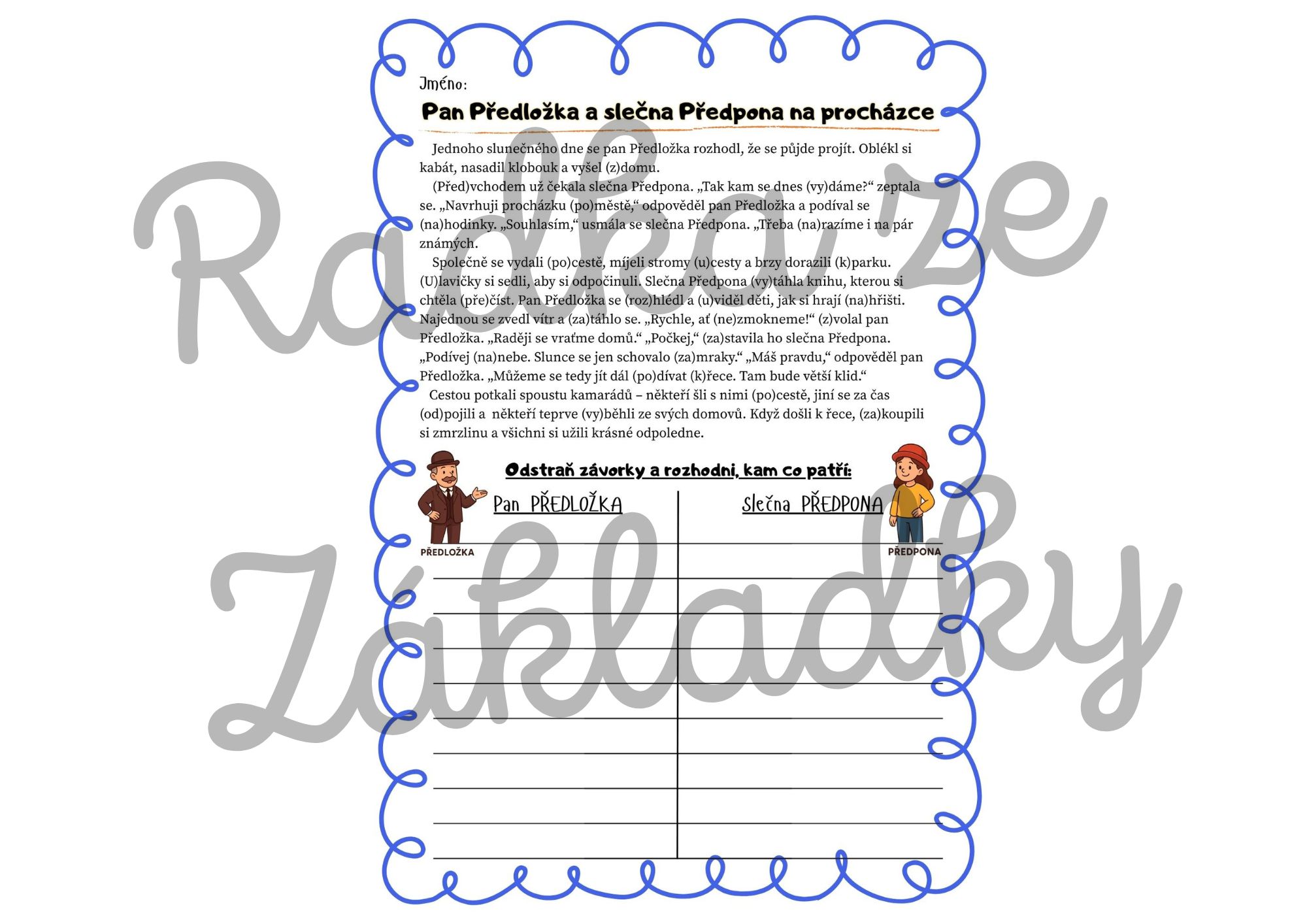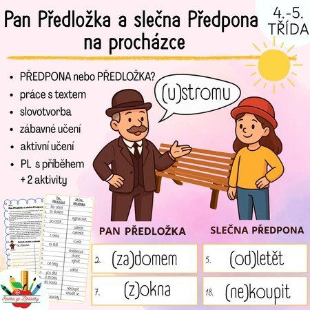 - Příběh „Pan Předložka a slečna Předpona na procházce“ obsahuje slova se závorkami (např. (do)města, (vy)šel).