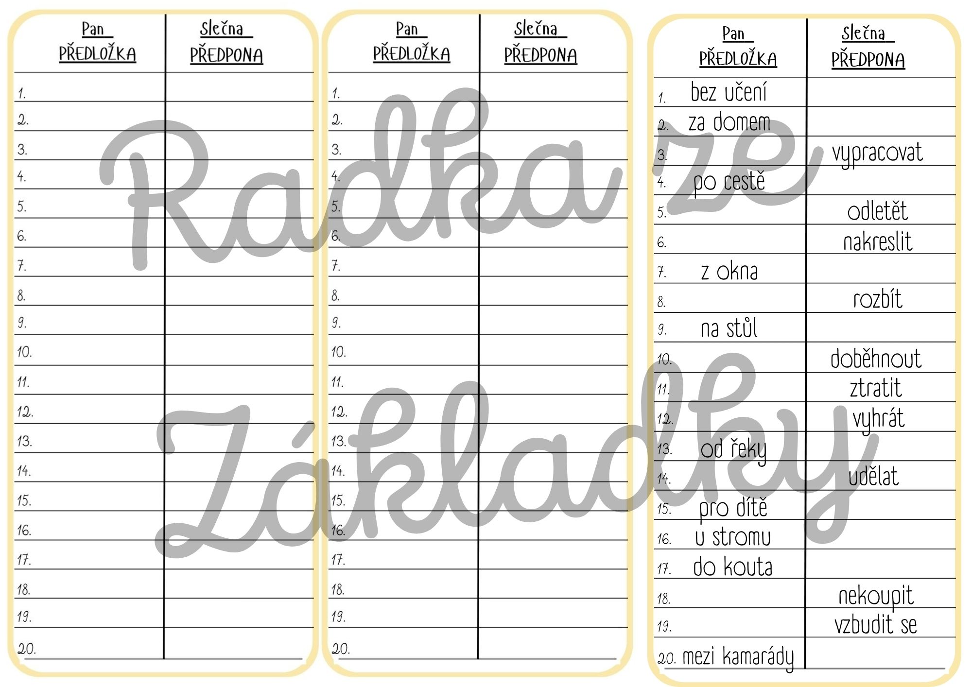 - Žáci rozhodují a zapisují, zda dané slovo patří k panu Předložkovi nebo slečně Předponě.