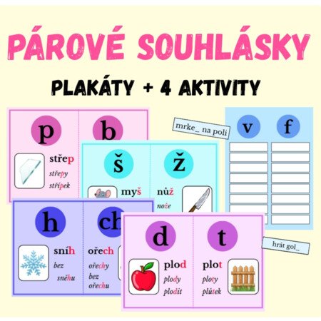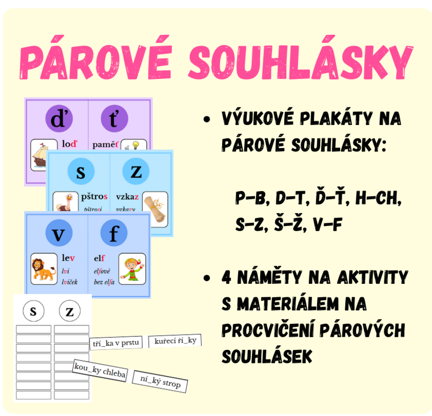 - výukové plakáty na párové souhlásky p-b, d-t, ď-ť, h-ch, s-z, š-ž, v-f