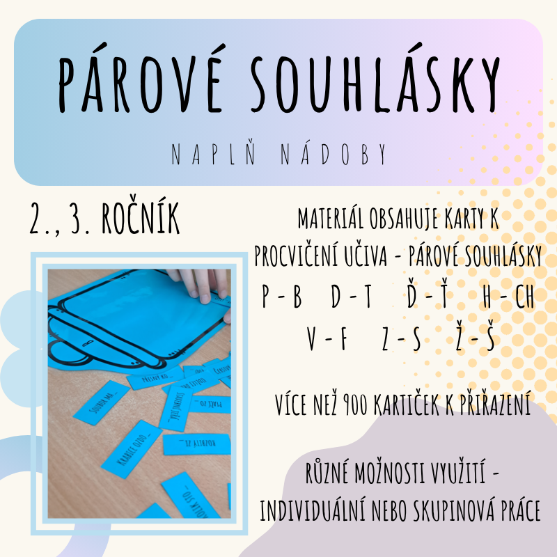1. Vytiskněte karty se slovními spojeními a k nim patřící nádoby se souhláskami (můžete vytisknout na různě barevné papíry a rozlišit tak párové souhlásky) .