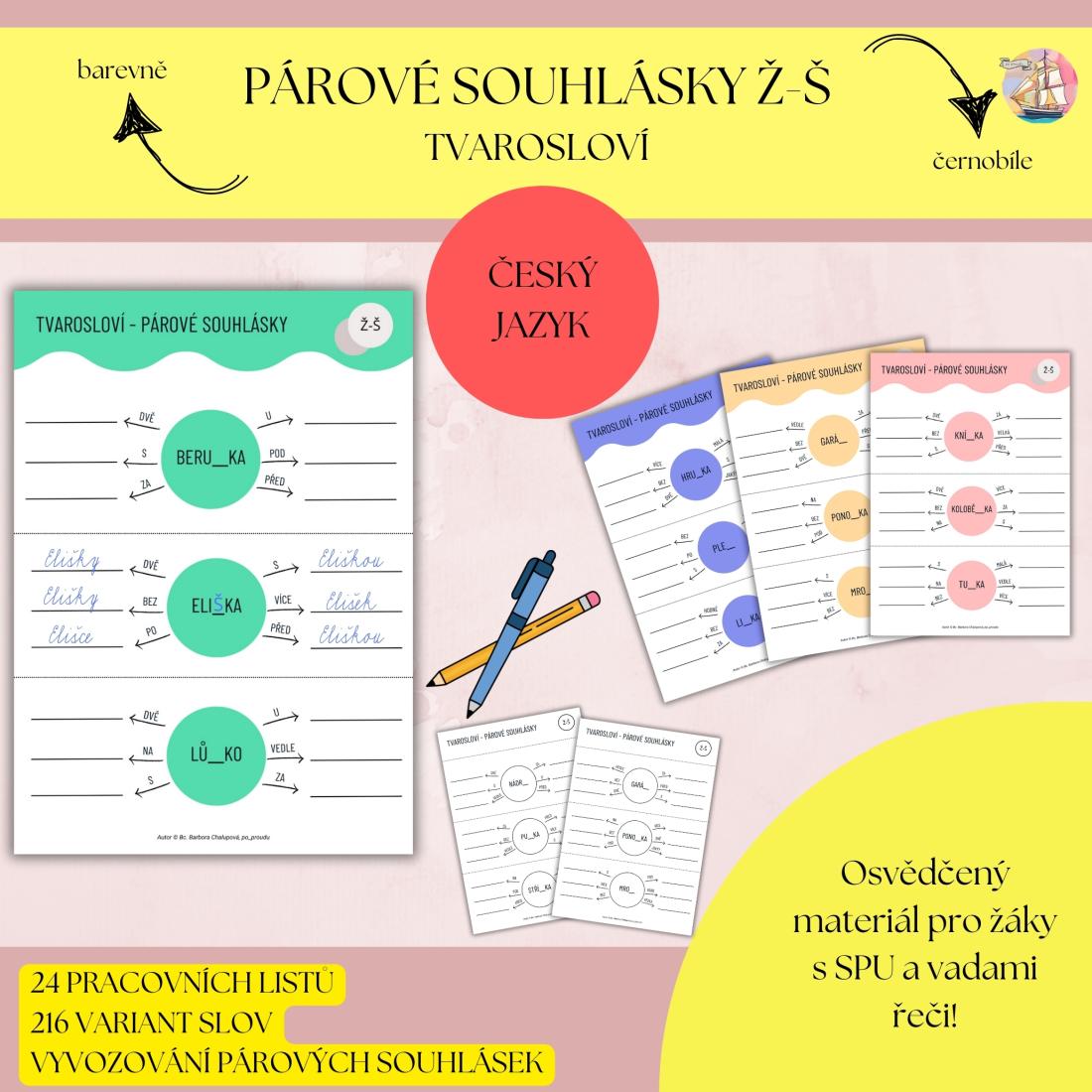 Pracovní listy na procvičování párových souhlásek Ž-Š jsou vhodné pro žáky 2.–4. ročníku ZŠ a osvědčily se zejména u dětí se specifickými poruchami učení a vadami řeči. Díky systematickému skloňování slov a práci s obrázky pomáhají lépe rozlišovat znělé a neznělé souhlásky a upevnit správný zápis slov. Možnost barevného zvýraznění správných tvarů podporuje vizuální vnímání a usnadňuje zapamatování. Materiál obsahuje 24 pracovních listů v barevné i černobílé verzi pro snadný tisk a zahrnuje také řešení pro rychlou kontrolu. Využitelný ve výuce i speciálněpedagogické péči.