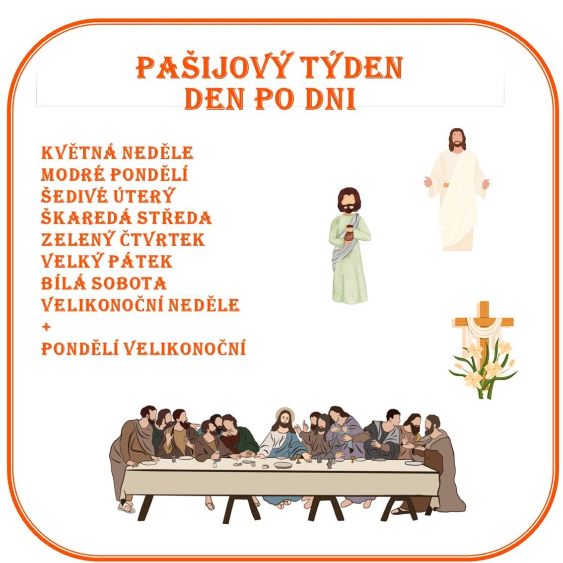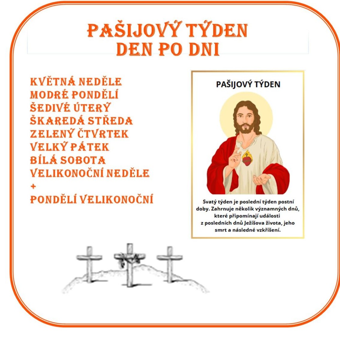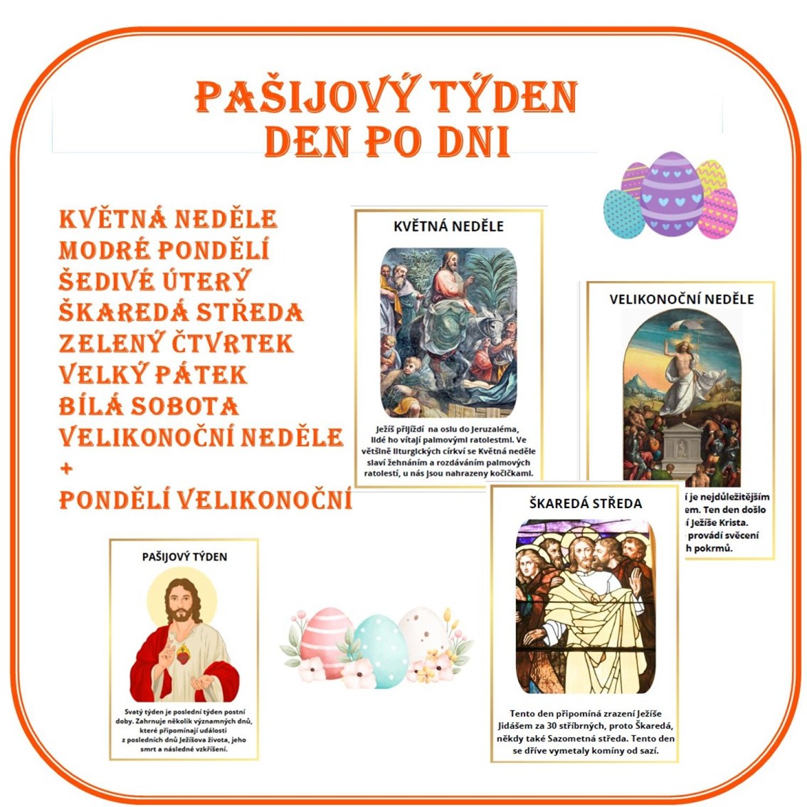 Výukové karty s jednotlivými dny pašijového týdne slouží jako vzdělávací nástroj pro žáky 1. i 2. stupně ZŠ. Pašijový týden je poslední týden postní doby a připomíná poslední dny Ježíše Krista před jeho ukřižováním.