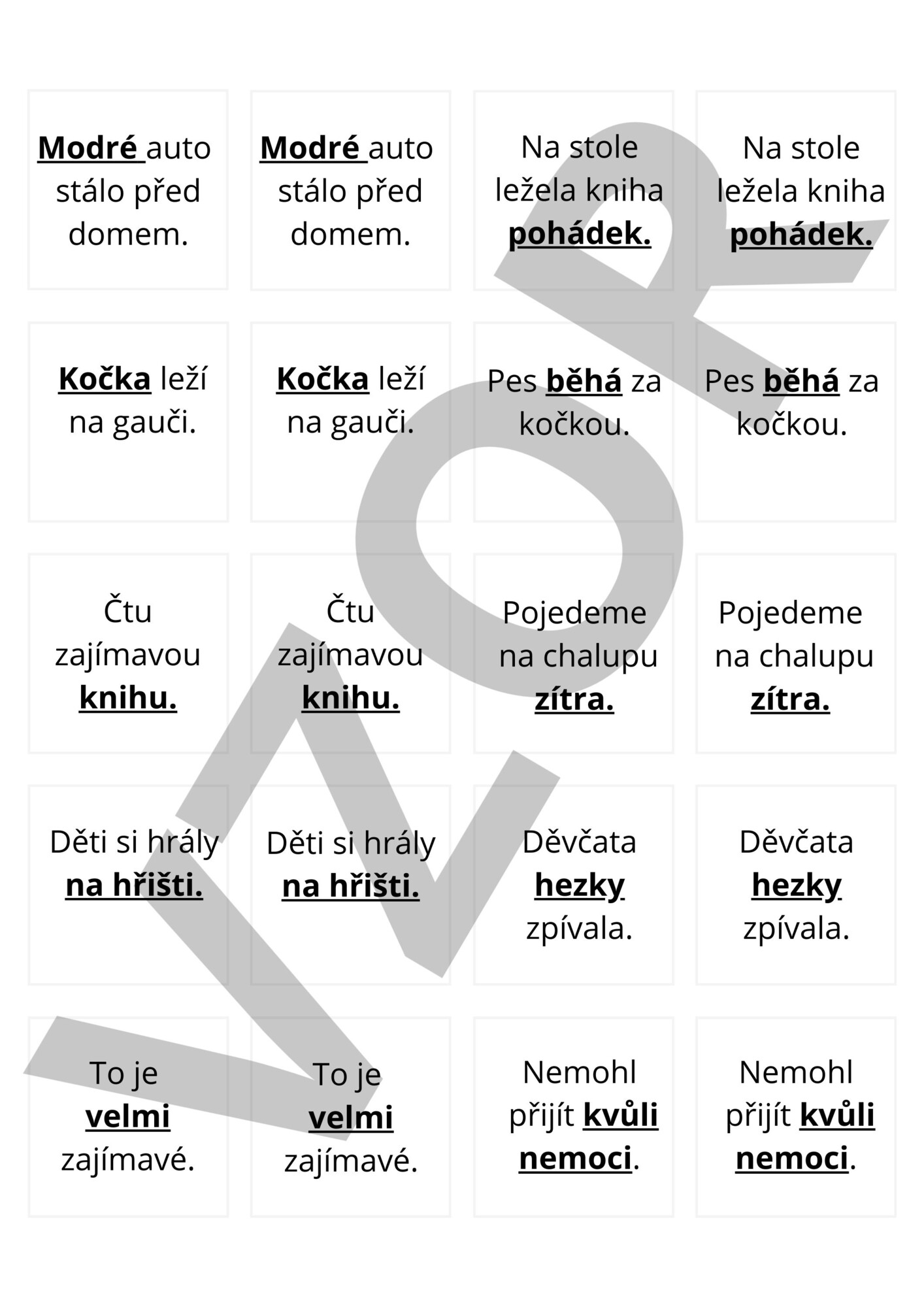 Pexeso na větné členy obsahuje tři verze hry, řešení a tabulku větných členů.