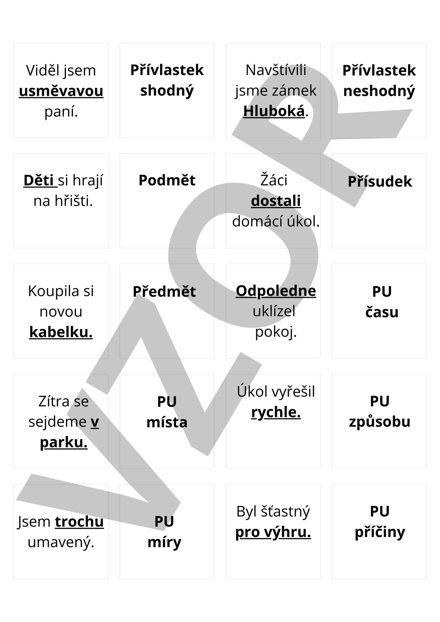Pracovní listy obsahují myšlenkovou mapu, určování mluvnických kategorií, podtrhávání přídavných jmen, doplňovací