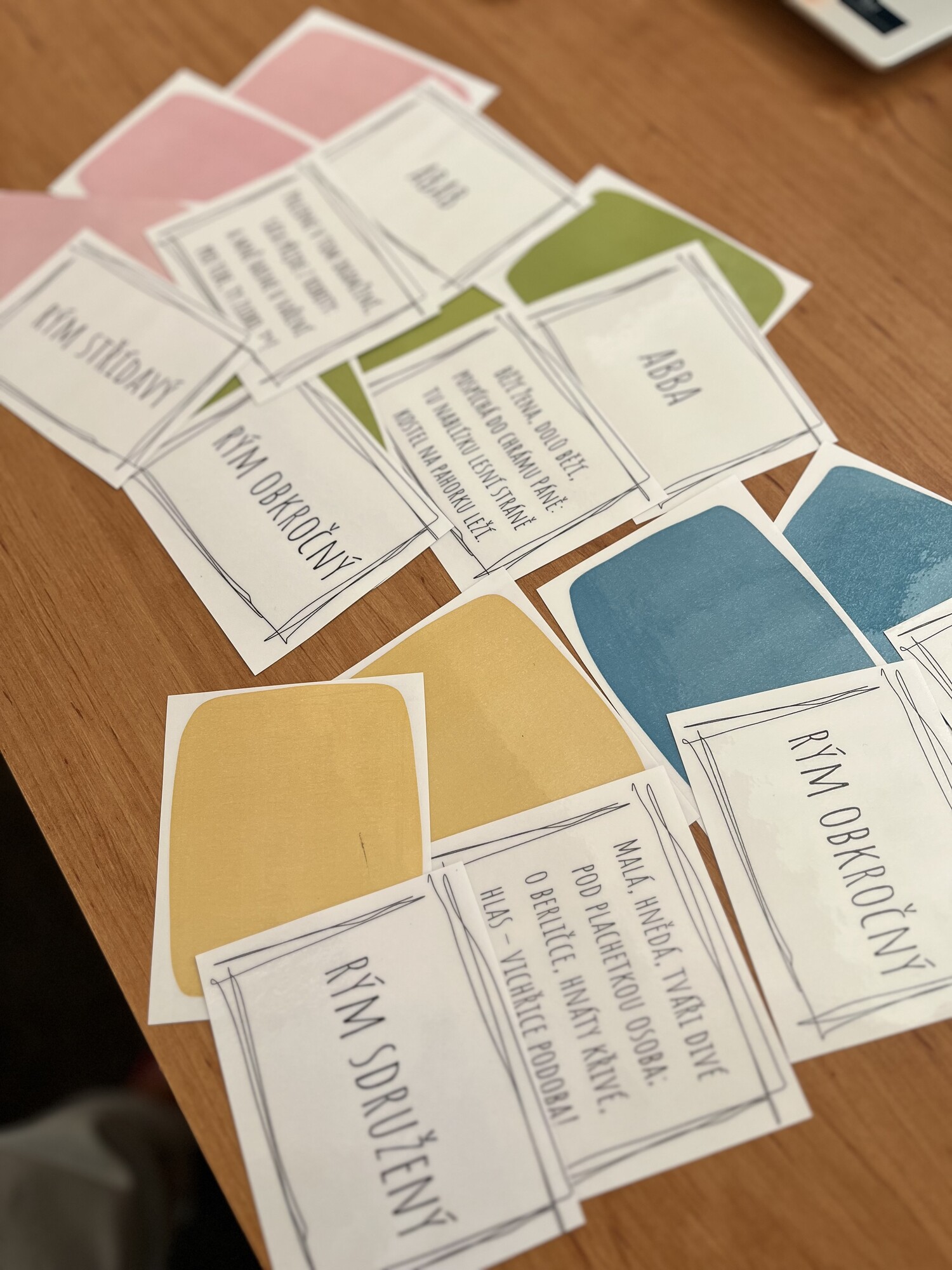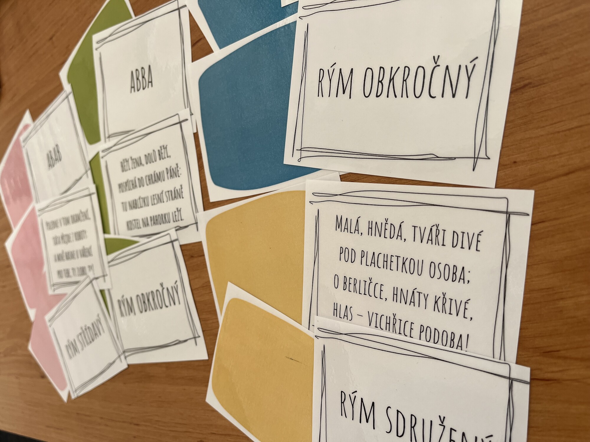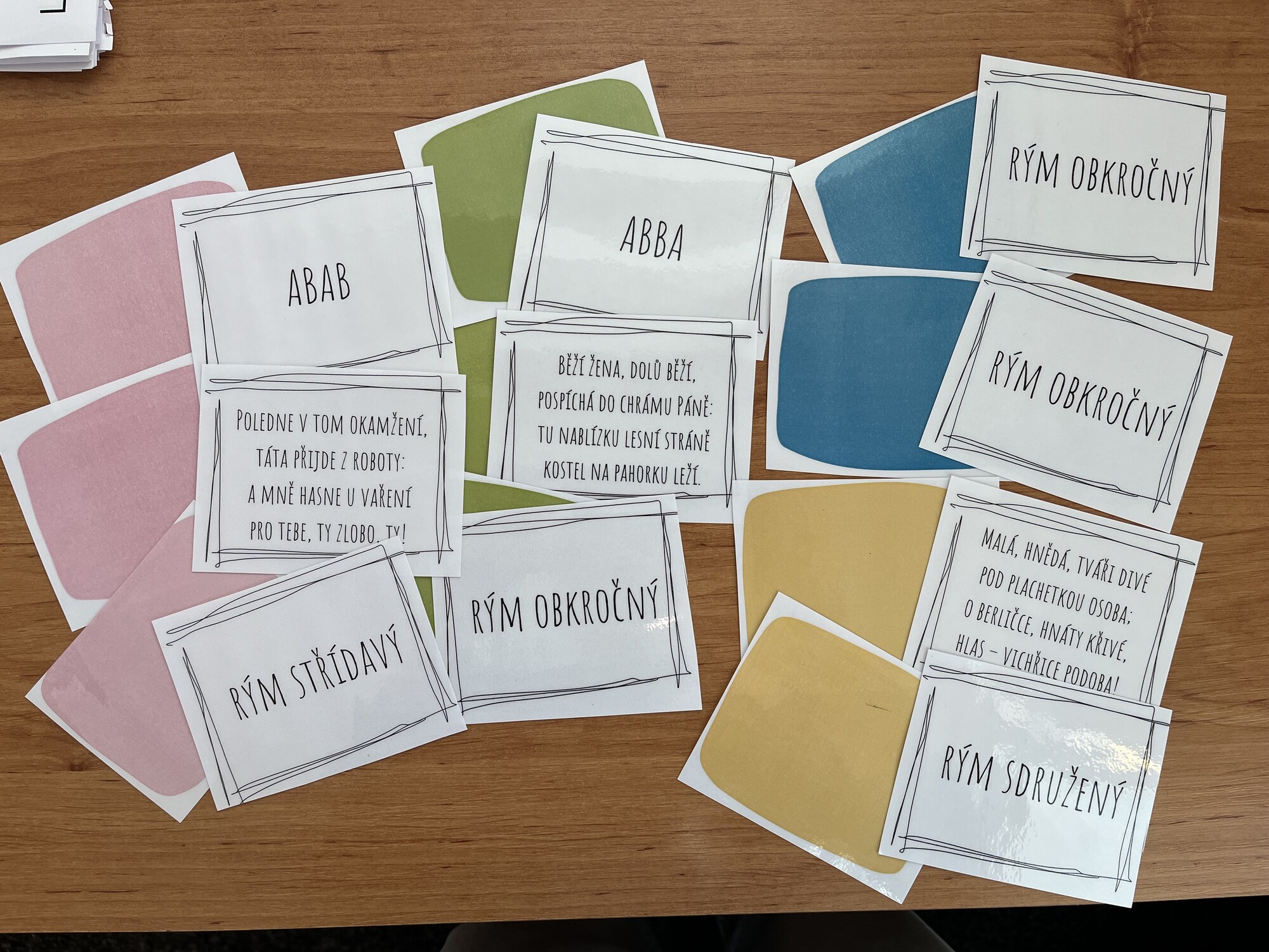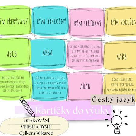 Materiál slouží k opakování veršů a rýmů, možno využít buď jako pexeso nebo jako spojování 3 karet dohromady (verš, rým, ukázka).