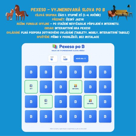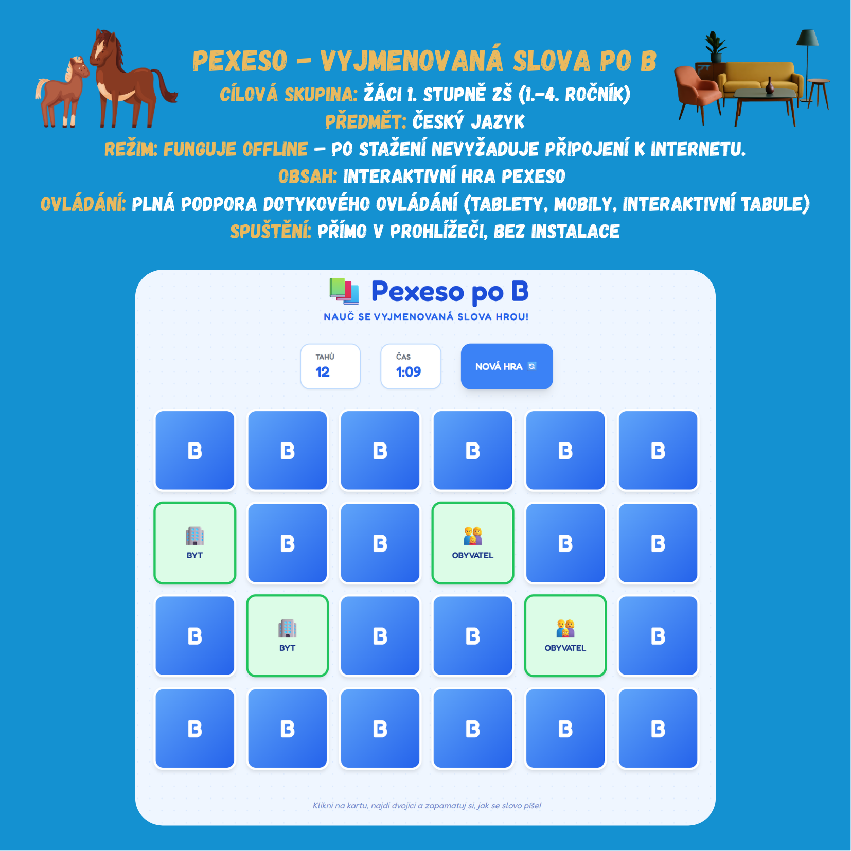 Hledáte způsob, jak proměnit drilování pravopisu v zábavu? Toto digitální pexeso je ideálním pomocníkem pro žáky 1. stupně ZŠ k upevnění vyjmenovaných slov po B.