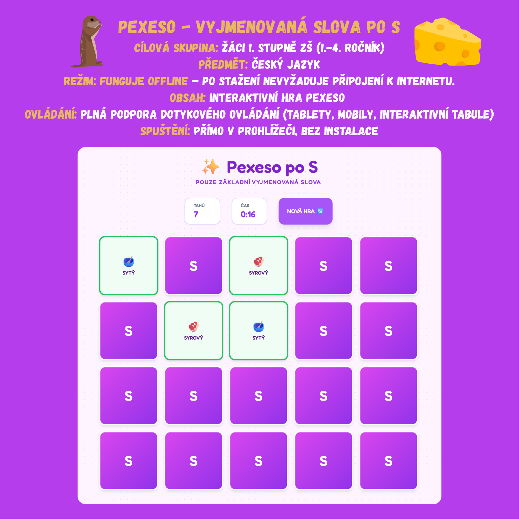 Hledáte moderní a zábavný způsob, jak s žáky procvičit vyjmenovaná slova po S? Tato digitální hra typu pexeso kombinuje vizuální paměť s pravopisným drillem v atraktivním, plně responzivním prostředí.